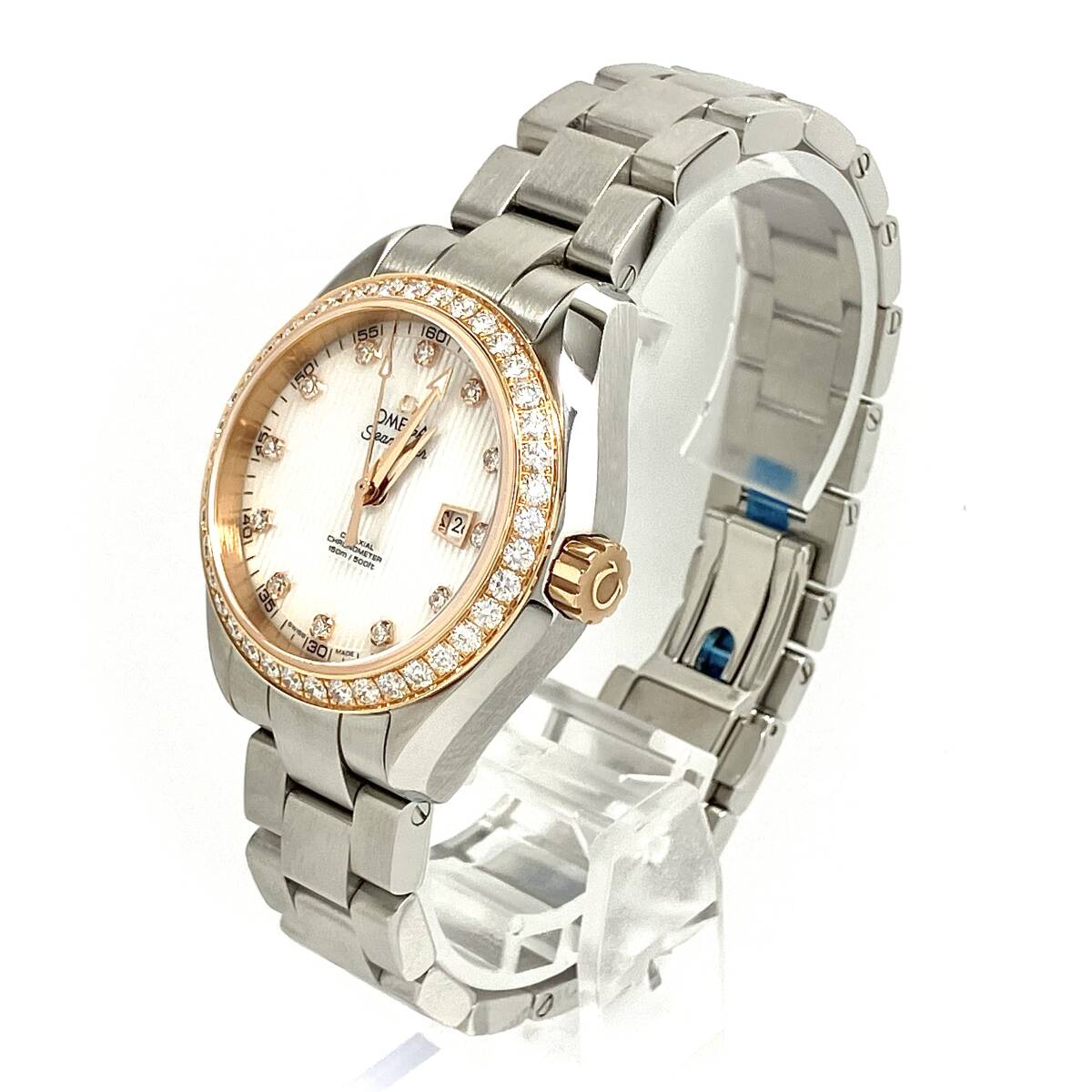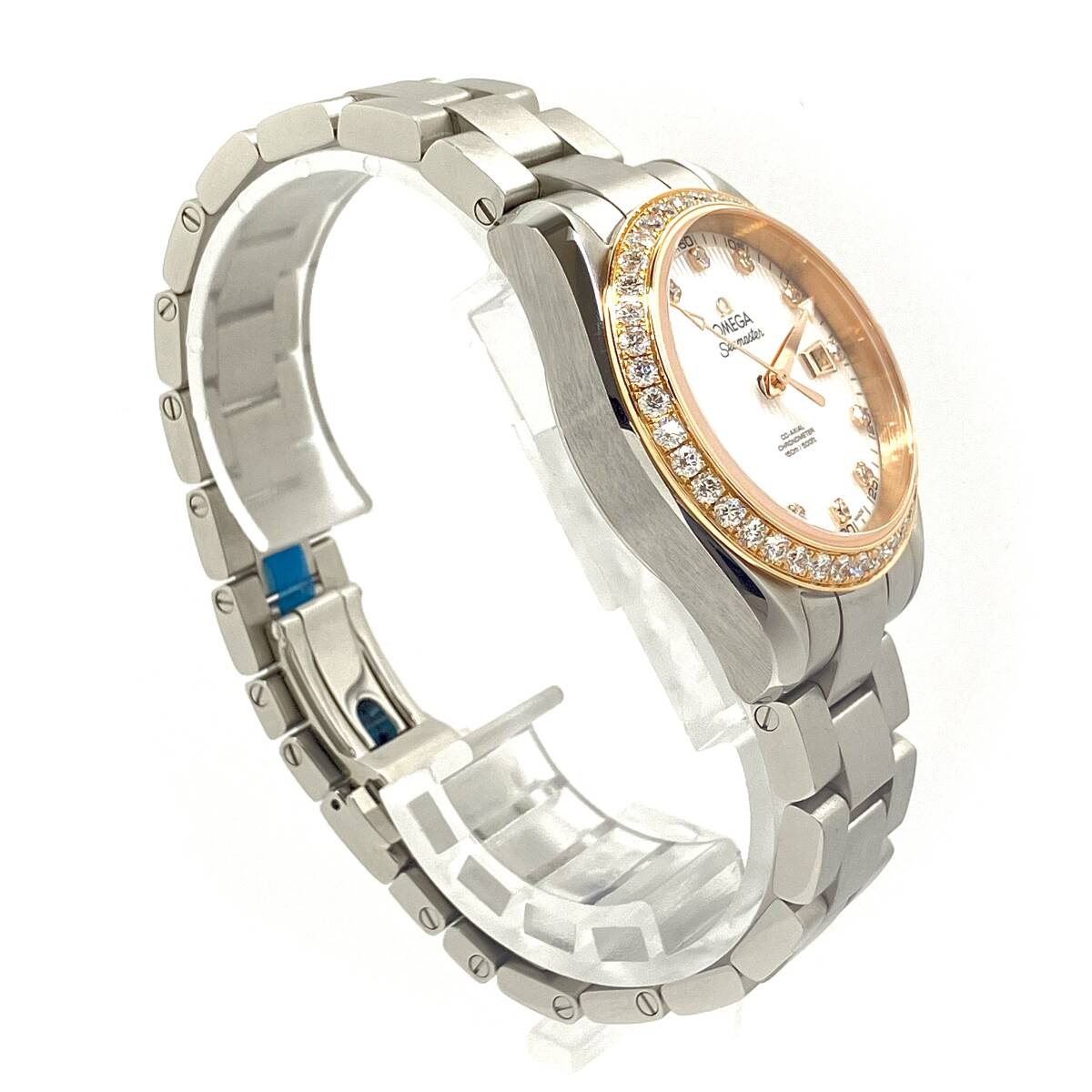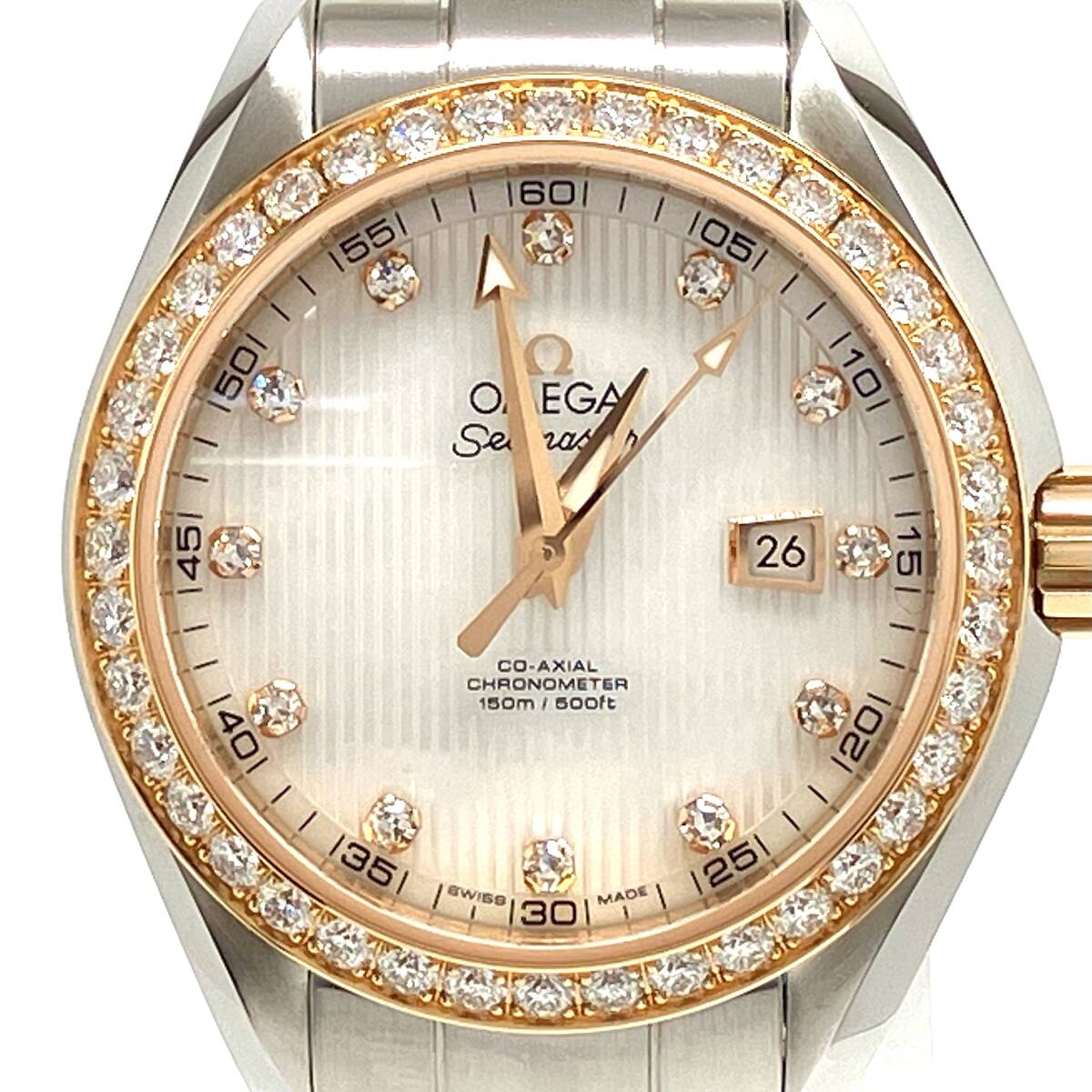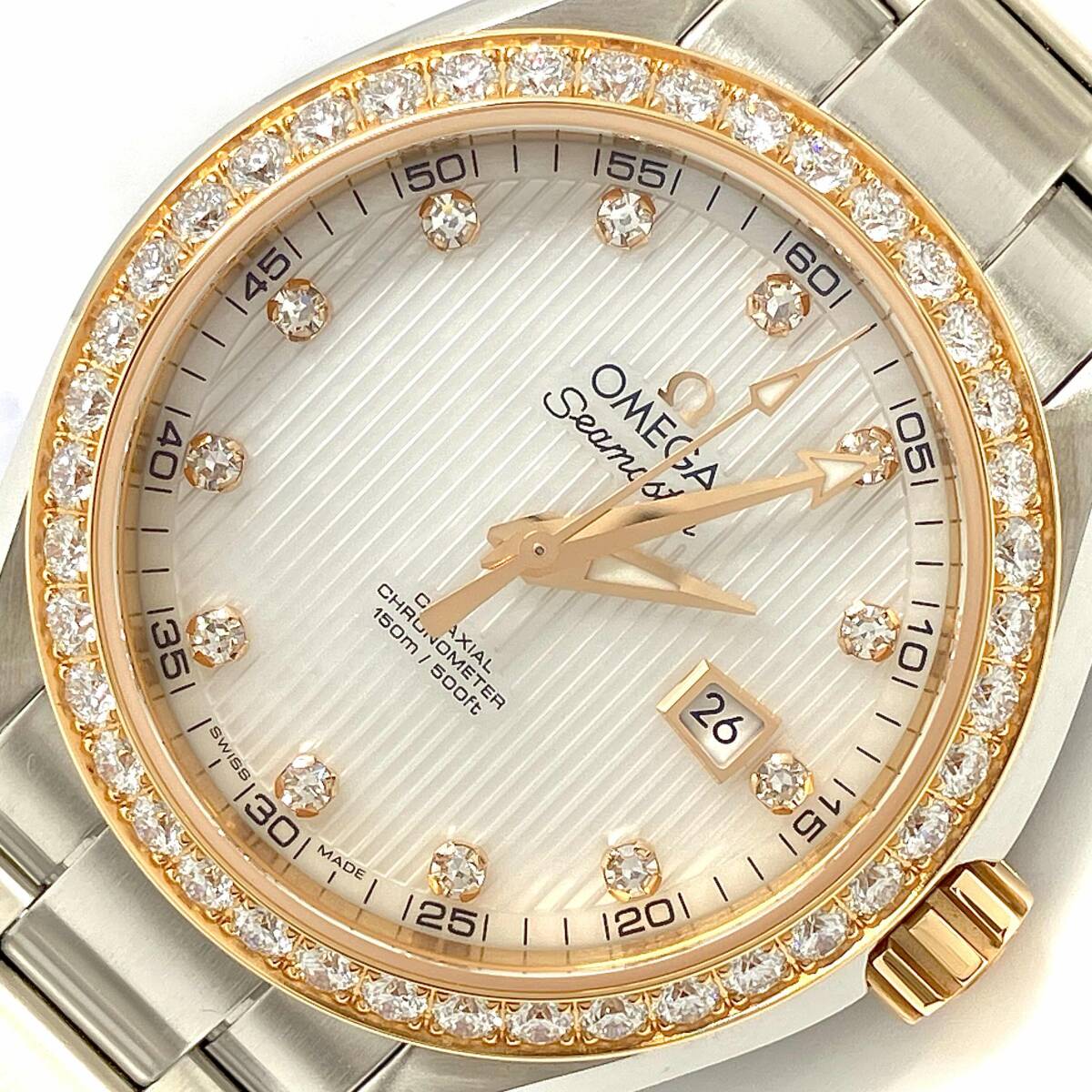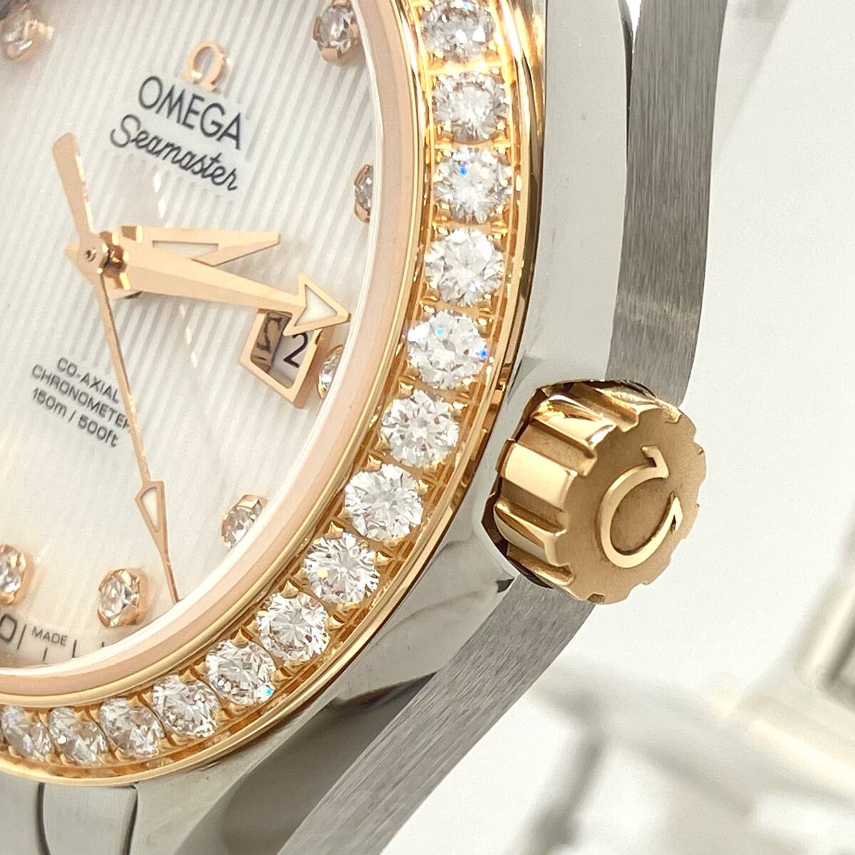 | 腕時計/腕時計/自動巻き ブランド:OMEGA/オメガ 型番:231.25.34.20.55.003 /231 モデル:アクアテラ 150M ライン:シーマスター 素材:レッドゴールド(ダイヤベゼル)/ステンレススティール 色:ゴールド/シルバー/ホワイトマザーオブパール/ダイヤインデックス その他:キャリバー:8520 クリスタル・風防:ドーム型強化無反射サファイアガラス 防水:150m/500フィート防水 機能:3針 パワーリザーブ:50時間 | ||||||
