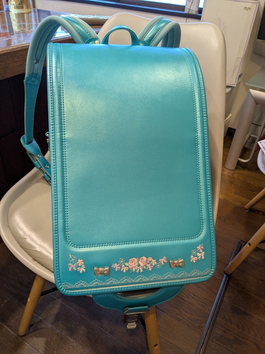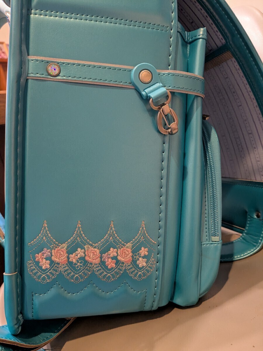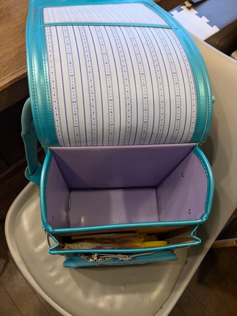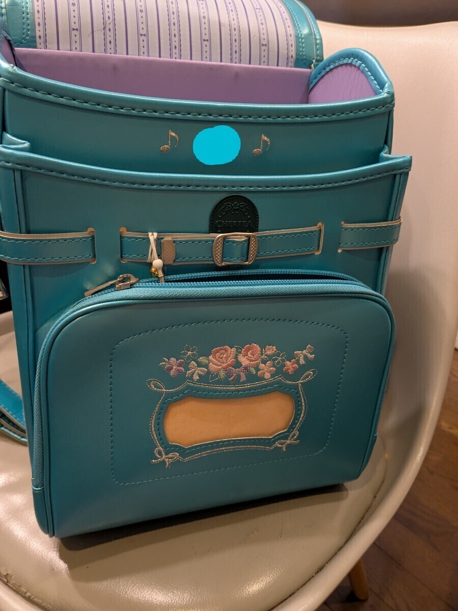 名前が刺繍してあるので自分で取ることができるそうです。付け替えのベルトは未使用です。中と背中の部分に少し汚れがあります。3年間使って引っ越すことになり、使わなくなりました。
