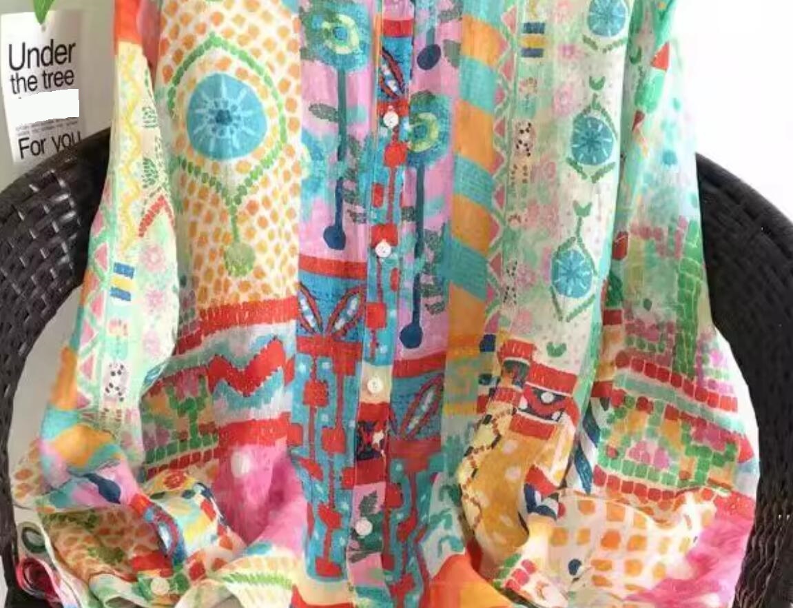 新入荷プリント花柄 フリーサイズ ワイシャツ チュニック トップス 麻100% 大人可愛 ナチュラル