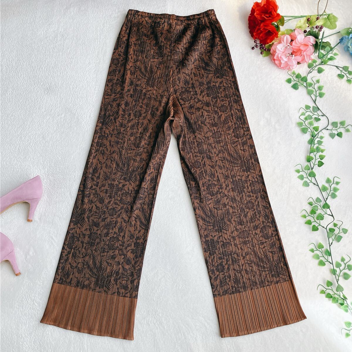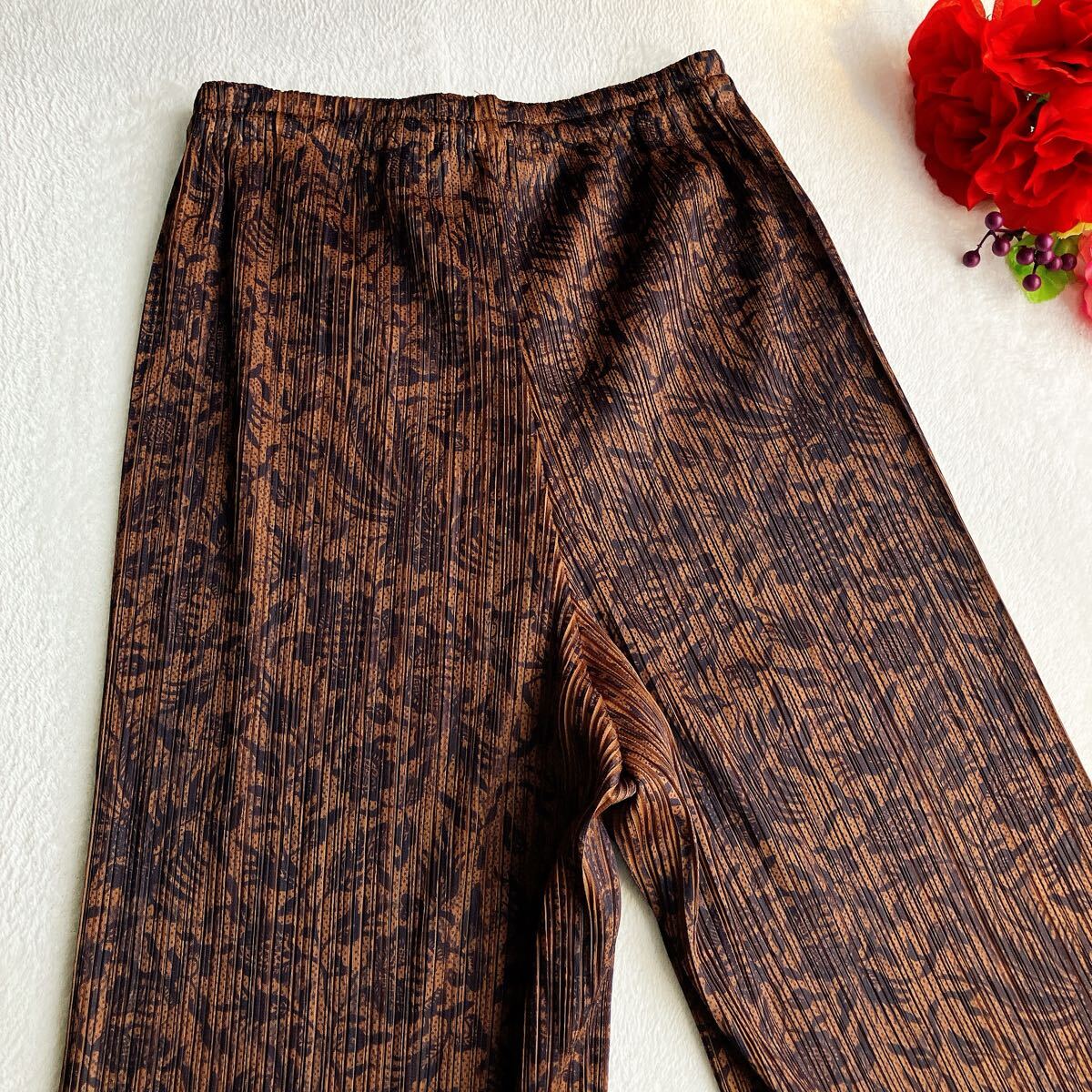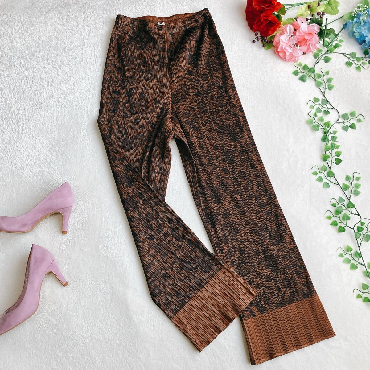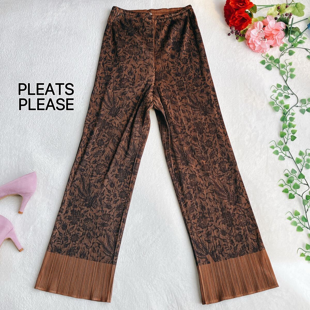 PLEATS PLEASE ISSEY MIYAKE プリーツプリーズ イッセイミヤケ★総柄 ハイウエスト ワイドパンツ 花柄 裾切替え ブラウン×ブラック