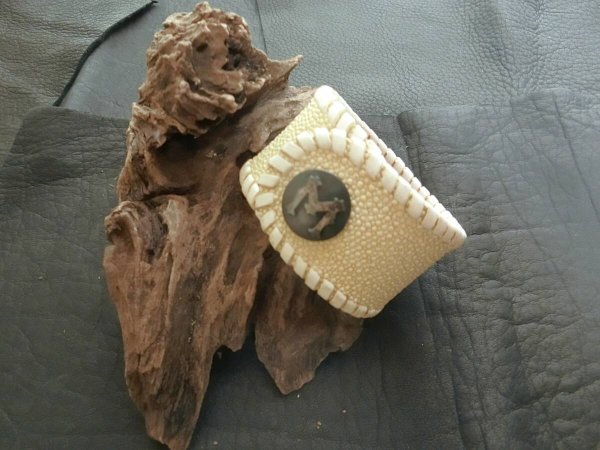 VAN AMBURG LEATHERS (ヴァンアンバーグレザーズ) と、 シルバーアクセサリーの老舗店であるMIC恵比寿がコラボしたスティングレイ(エイ革)の黒くいぶし加工が施されたシルバー925製のコンチョボタン(コンチョは取り外しできません。)が付いたレザーブレスレットです。