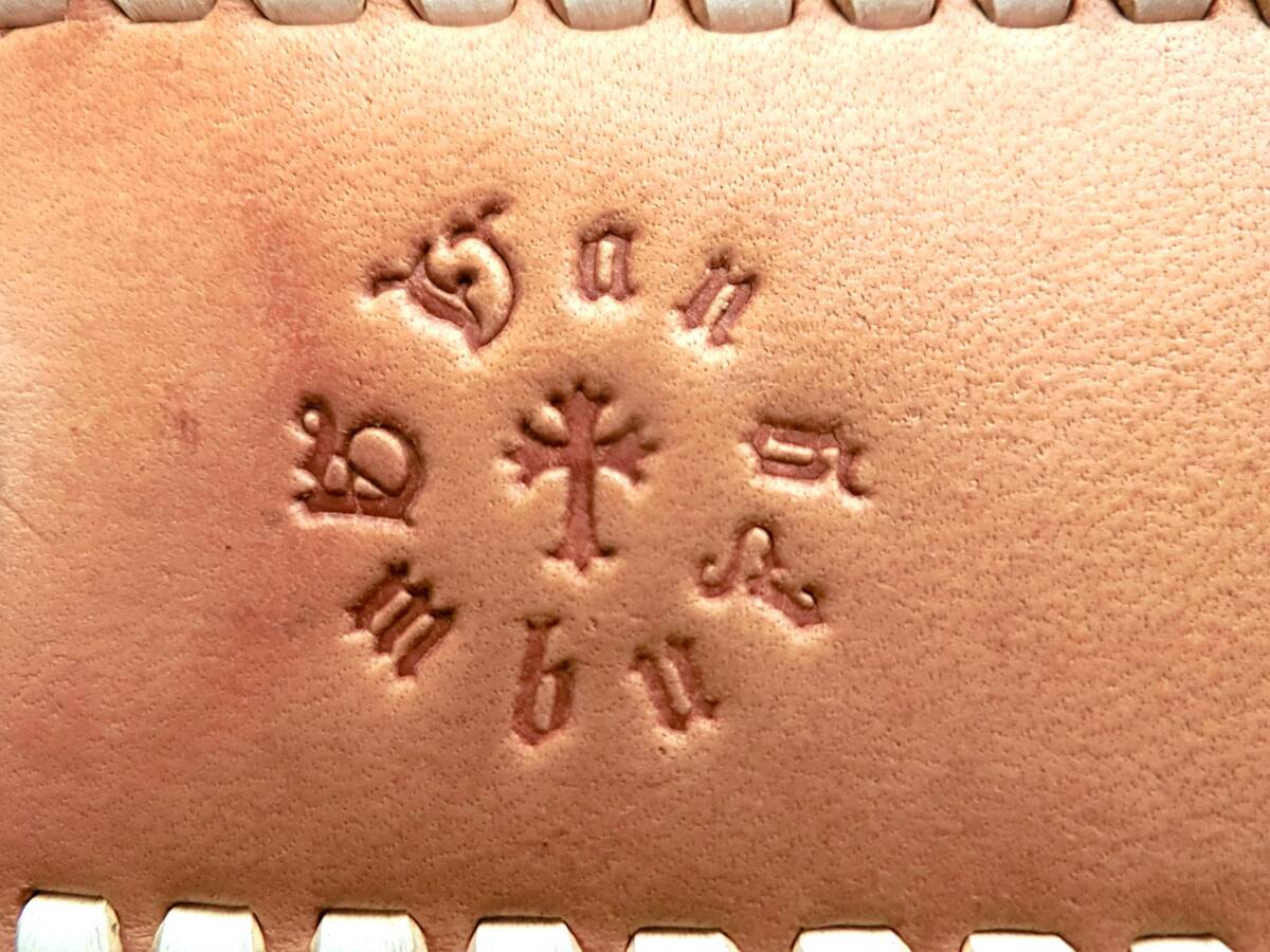 カラーはエイ革の染色されていないエイ革本来のオフホワイト系の色で、裏側は牛革の染色していないヌメ革を使用しております。フチ側はホワイトの牛革で編み込まれております。