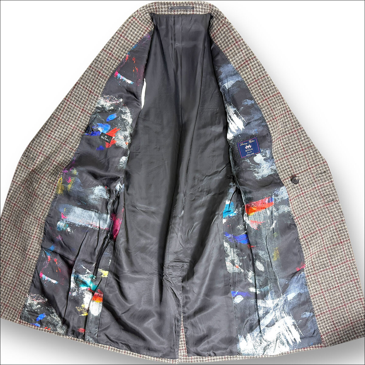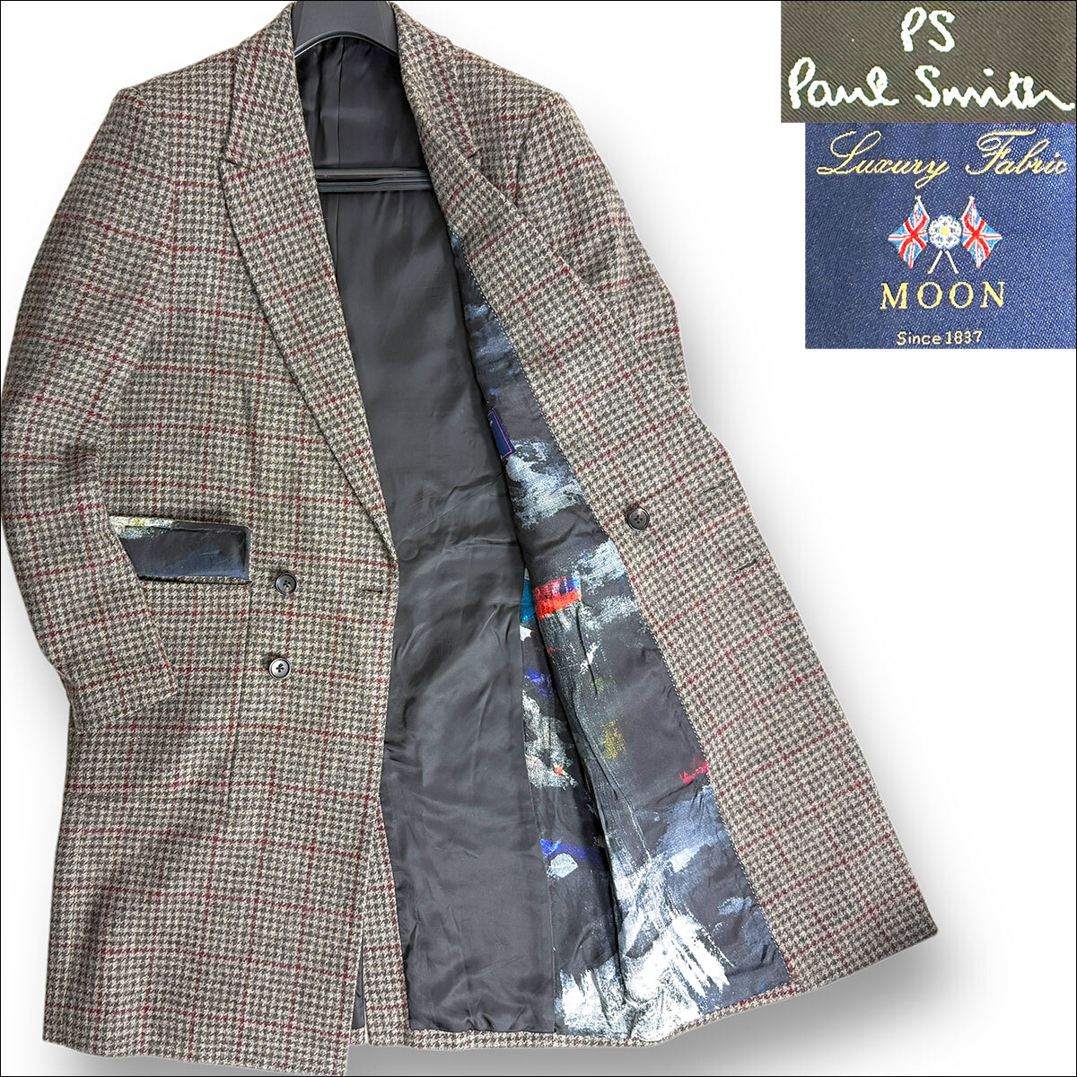 J3030 美品 ポールスミス MOON生地ハウンドトゥース ツイード ダブルブレストチェスターコート グレー系 XL Paul Smith