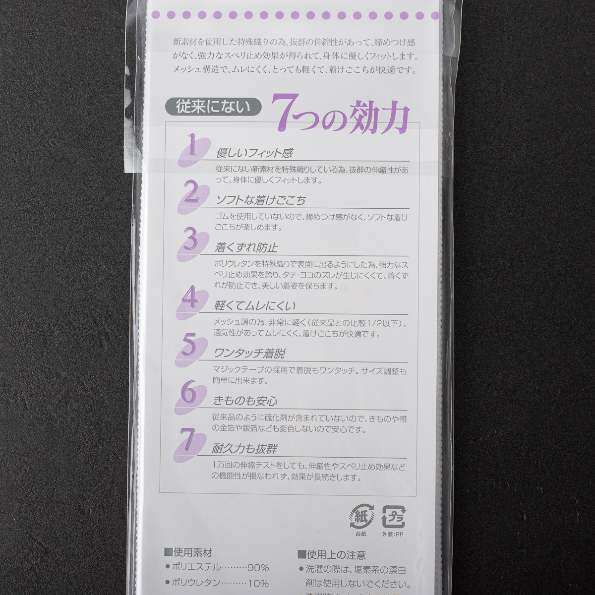 特 徴 従来にない7つの効力 1.優しいフィット感 従来にない新素材を特殊織している為、抜群の伸縮性があって、身体に優しくフィットします。 2.ソフトな着け心地 ゴムを使用していないので、締め付け感がなく、ソフトな着け心地が楽しめます。 3.着崩れ防止 ポリウレタンを特殊織で表面に出るようにした為、強力な滑り止め効果を誇り、タテ・ヨコのズレが生じにくく、着くずれが防止でき、美しい着姿を保ちます。 4.軽くてムレにくい メッシュ調の為非常に軽く通気性があってムレにくく、着け心地が快適です。 5.ワンタッチ着脱 マジックテープの採用で着脱もワンタッチ。サイズ調節も簡単にできます。 6.着物も安心 従来品のように硫化剤が含まれていないので、着物や帯の金箔や銀箔なども変色しないので安心です。 7.耐久性も抜群 一万回の伸縮テストをしても、伸縮性や滑り止め効果などの機能性が損なわれず、効果が長続きします。 送料込 【2,290円】で出品です。 複数個対応も可能です。ご希望の場合は「出品者への質問」よりお問い合わせ下さい。 |