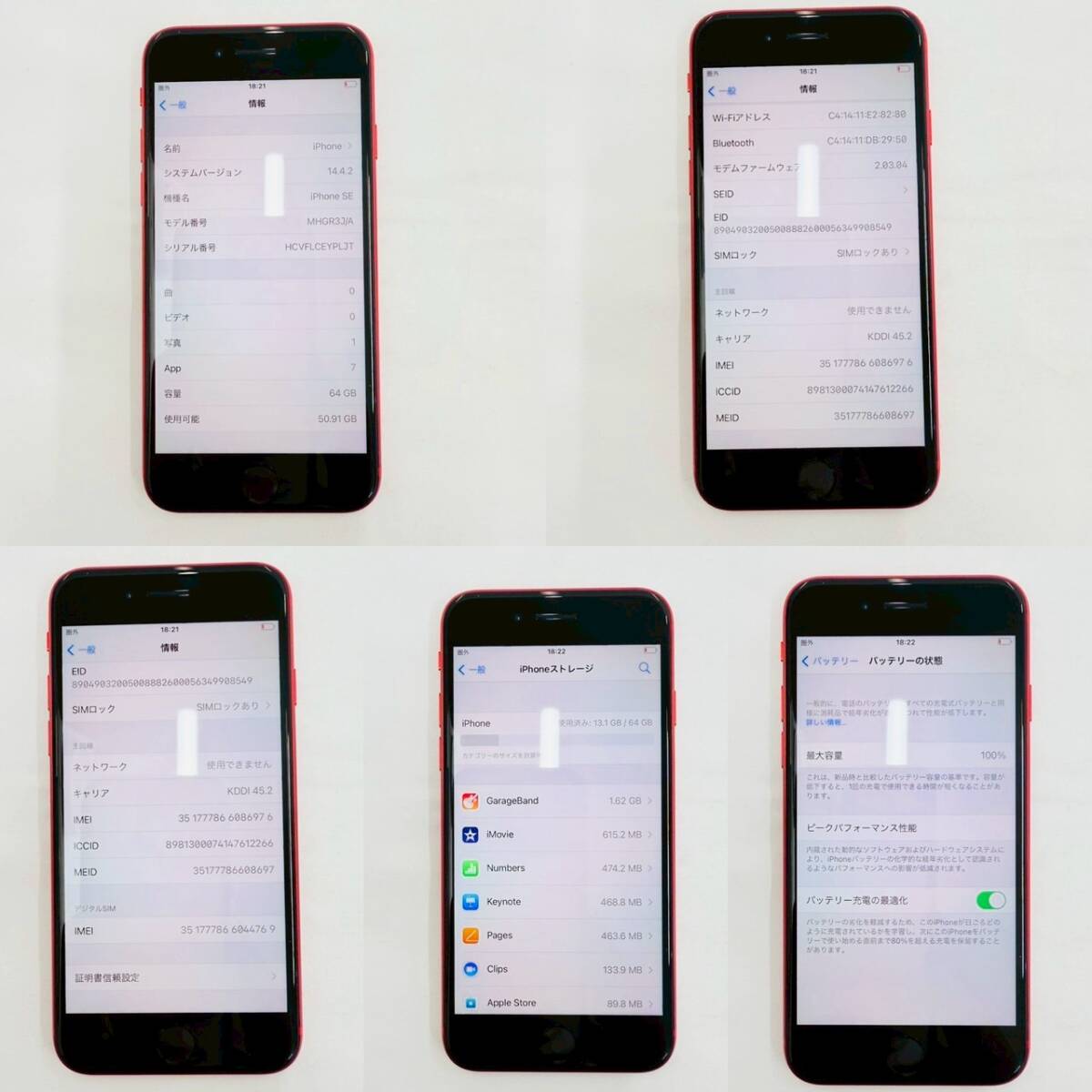 H2121*18 極美品 初期化済み Apple アップル iPhone SE アイフォン MHGR3J/A 第2世代 64GB 最大容量100% SIMロックあり レッド |