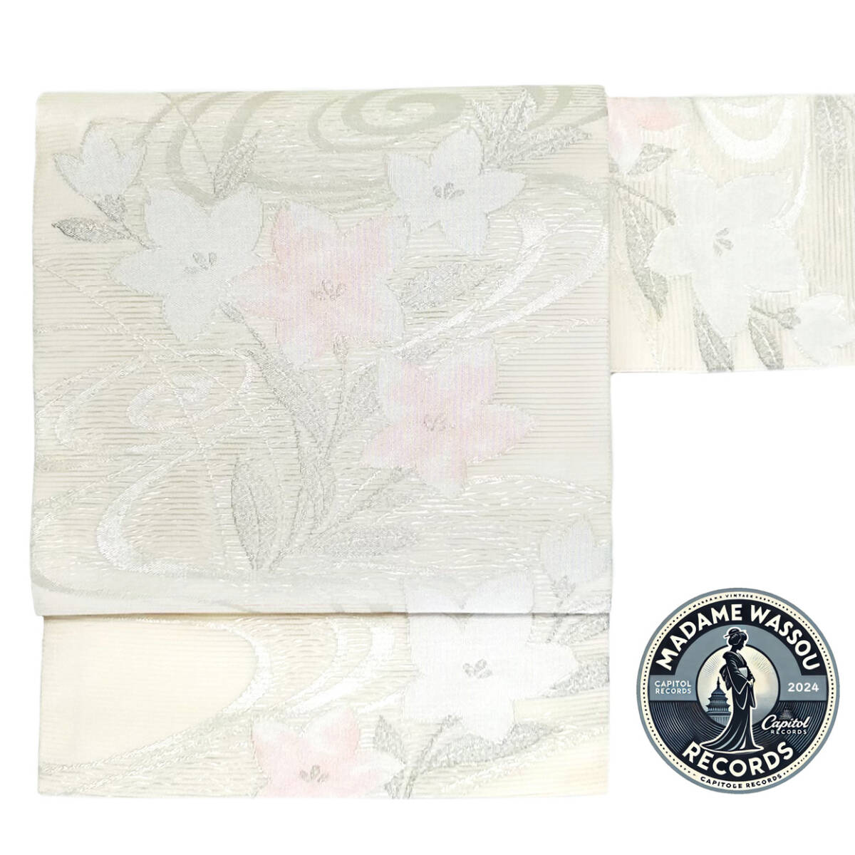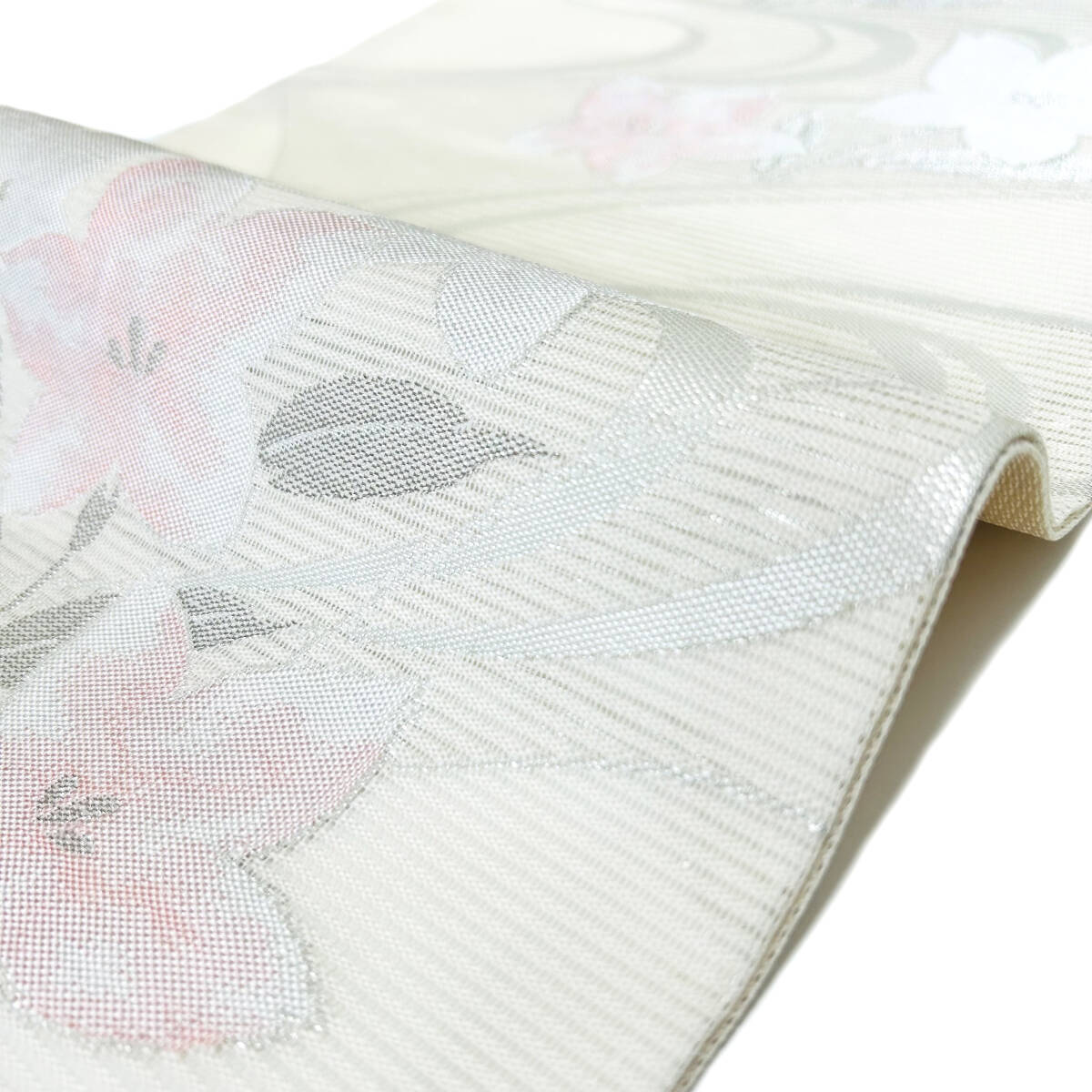 名古屋帯 九寸 正絹 銀糸 夏帯 絽 桔梗 流水文様 六通柄 アイボリー カジュアル 綺麗 仕立て上がり MWR-No.254 01092025 マダム 和装