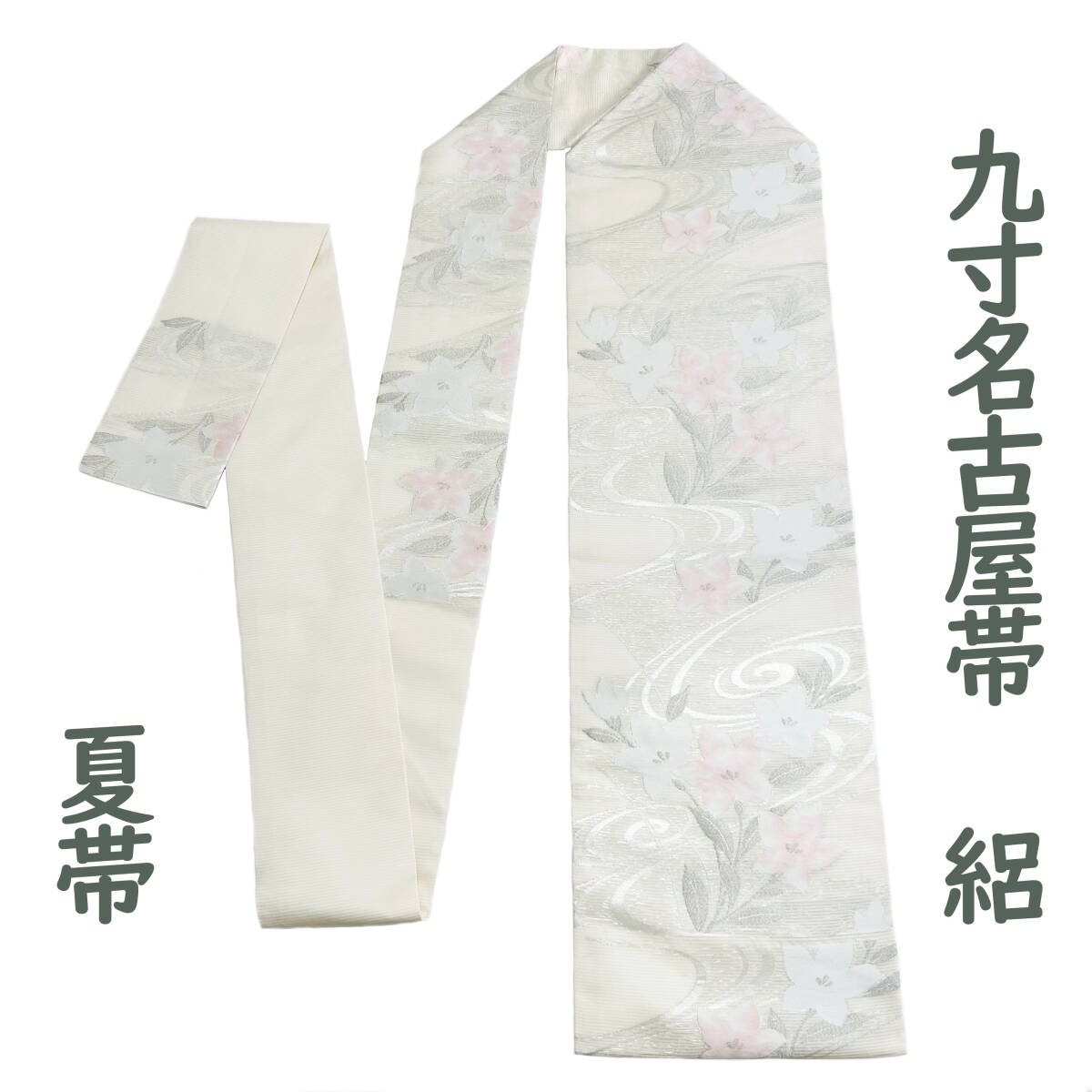 ★九寸名古屋帯 正絹 銀糸 夏帯 絽 桔梗 流水文様 六通柄 アイボリー カジュアル 綺麗 仕立て上がり 送料無料★