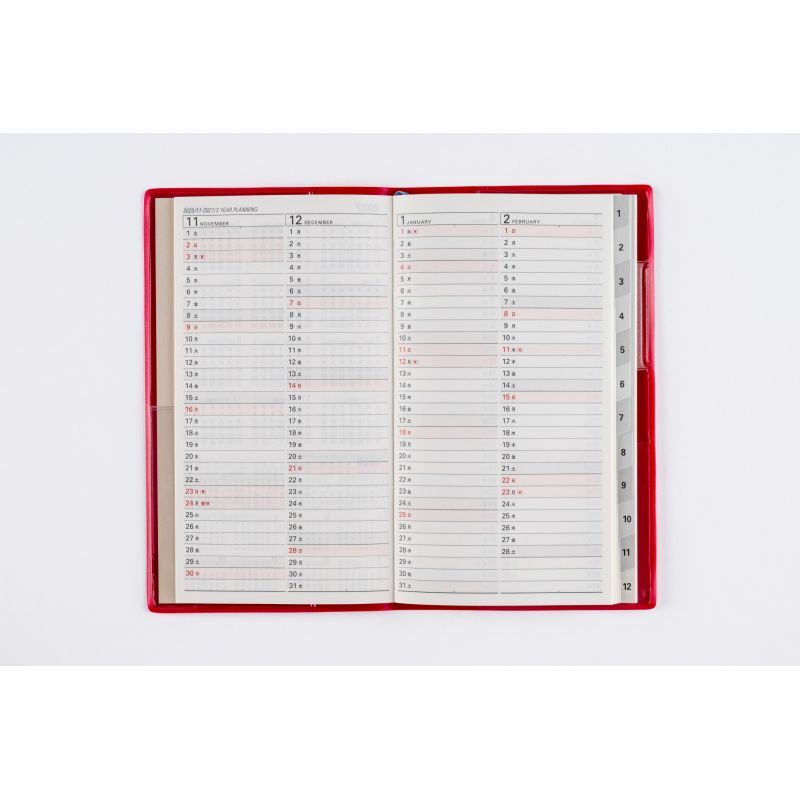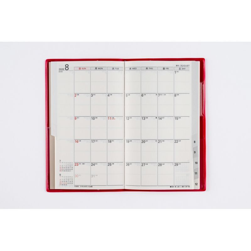 「薄さ」と「軽さ」が人気の土日均等タイプ。1冊目にはもちろん、趣味用のサブ手帳としてもオススメ。月別インデックス付き。