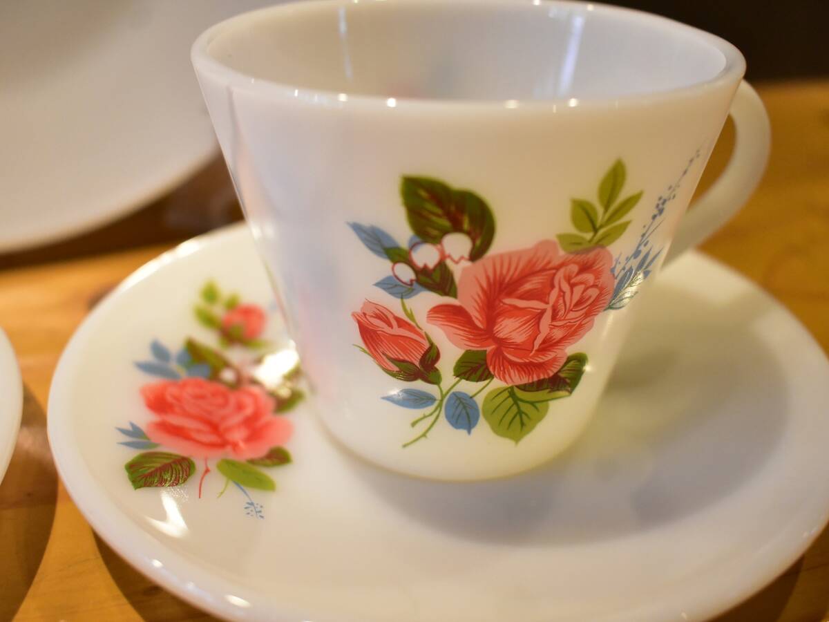 イギリス JAJ Pyrex パイレックス コテージローズのカップ、ソーサー、プレート(大&小)4点セット ミルクガラス バラ柄 花柄