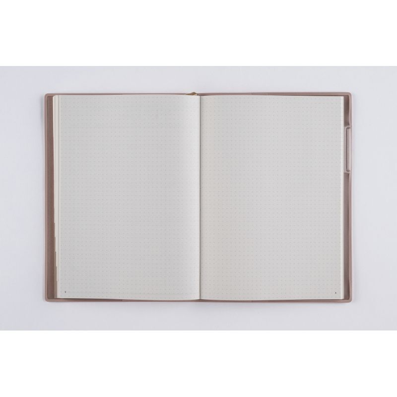 【週間予定表】左ページは1週間分のスケジュール欄、右ページはドット方眼メモ。1週間分のスケジュールは、3分割にできる目盛りを「午前・午後・夜」などで区切って自由にアレンジすることができます。