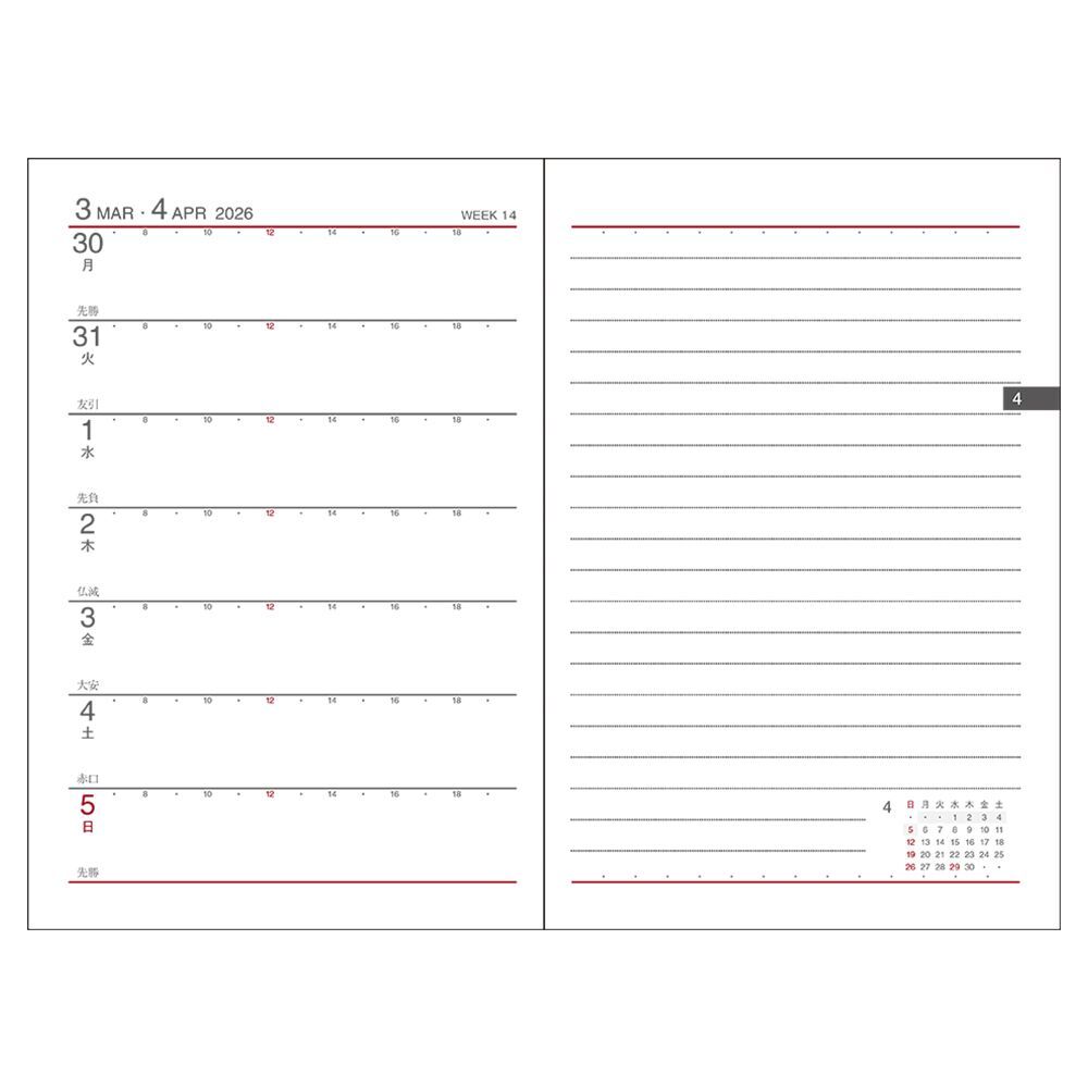 左半分が1週間のスケジュール、右半分が横罫のメモスペースで、1週間の予定とメモを見開きで管理できる1番人気のレイアウトです。