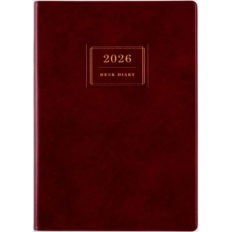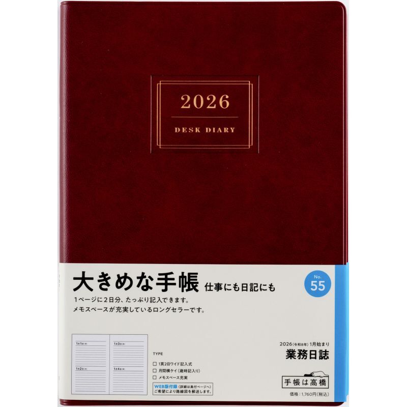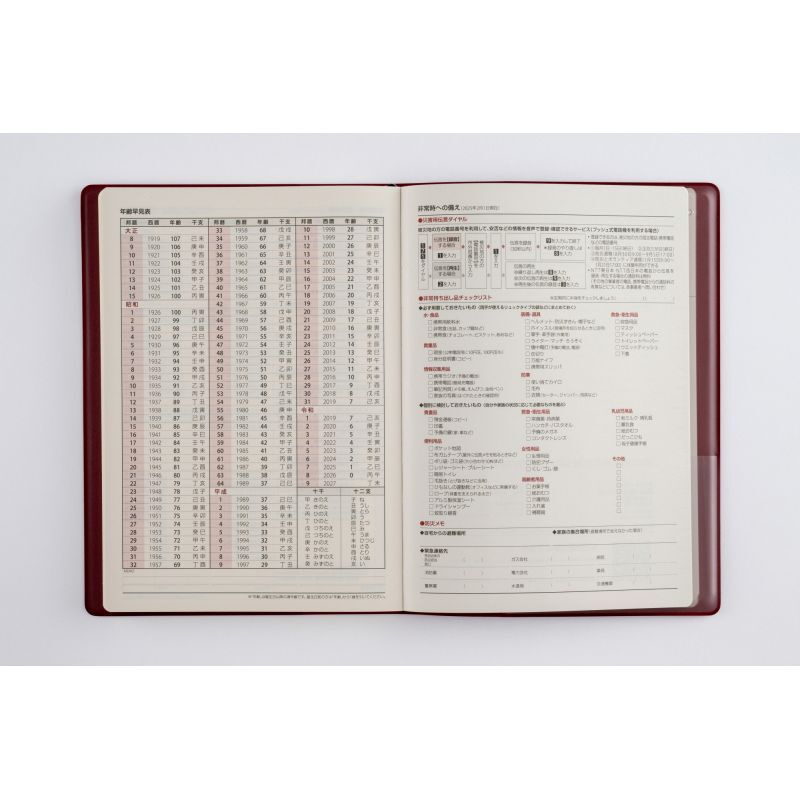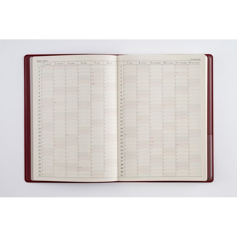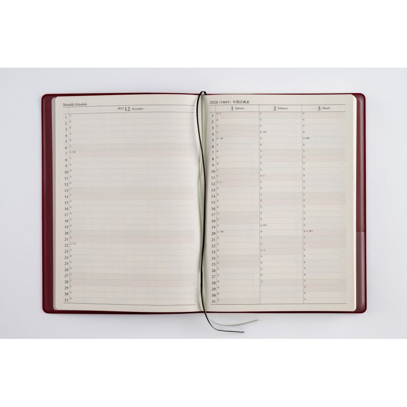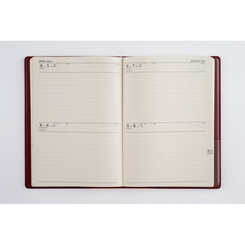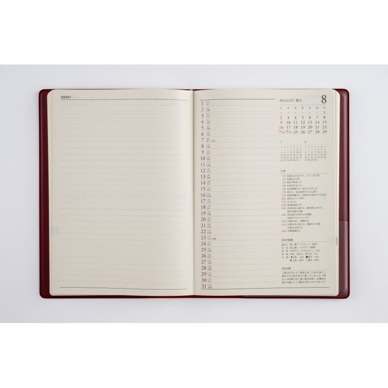 高級感があるエンジ色のカバー。1頁2日の記入形式はたくさん書きたい方におススメのロングセラー商品です。毎月の月扉では、月相や暦情報などの役立つ情報も掲載しています。