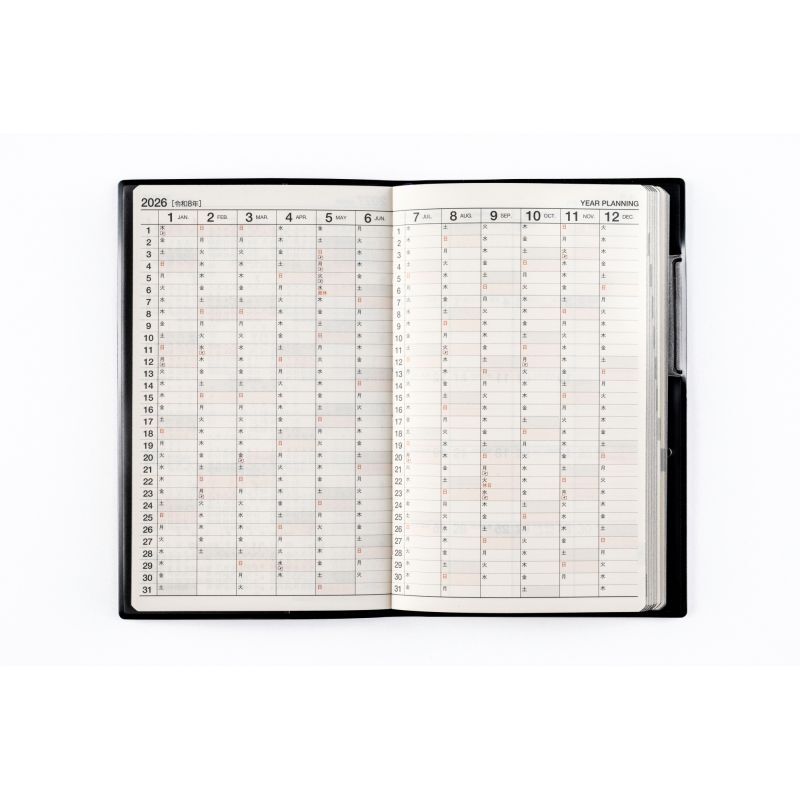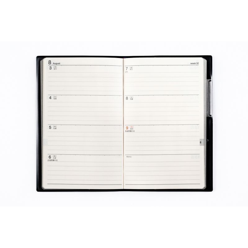 【週間予定表】左ページには4日分のスケジュール欄、右ページには3日分のスケジュール欄とメモ欄を掲載。1日分の記入スペースが広いので、ビジネスユースはもちろん、ちょっとした日記としてもご使用いただけます。