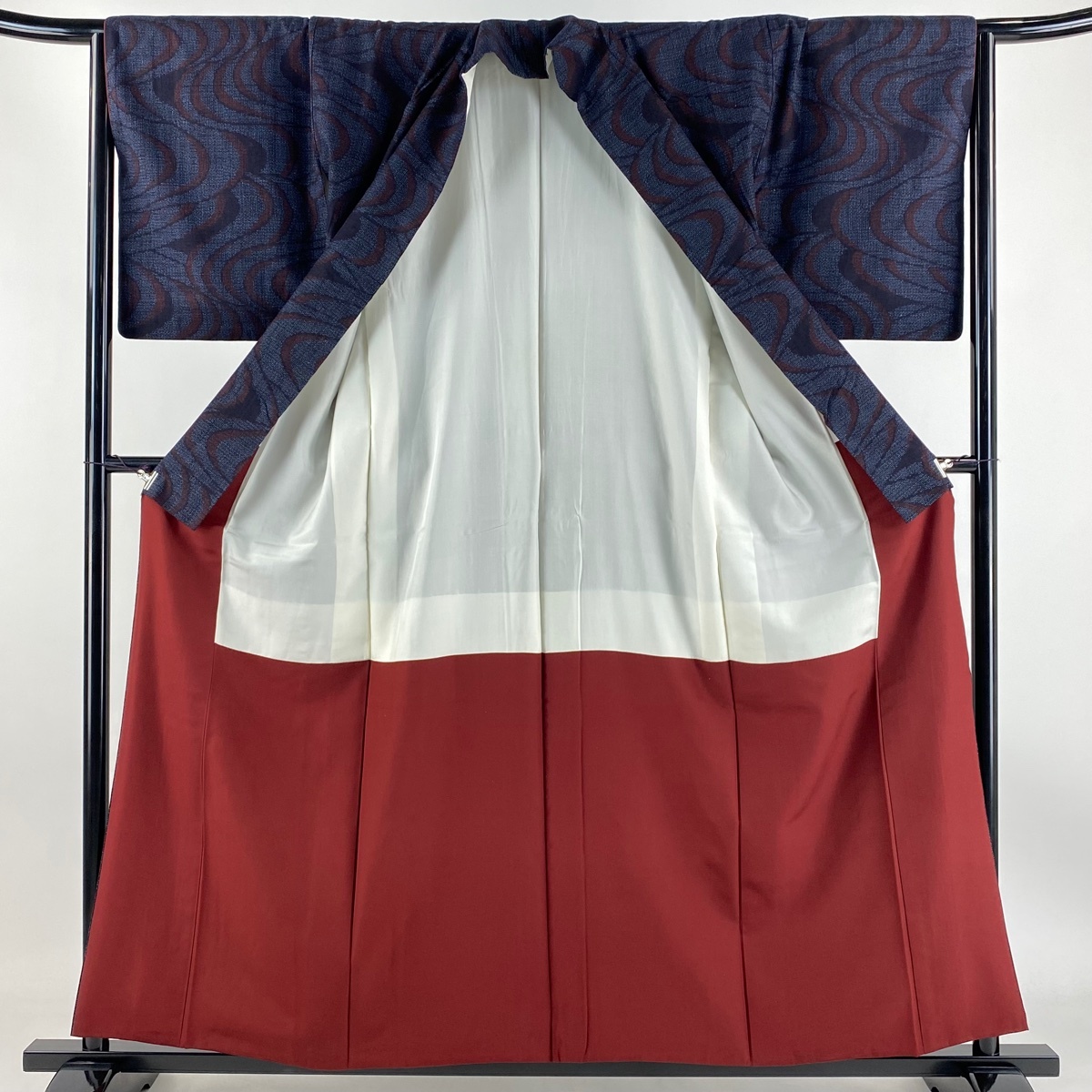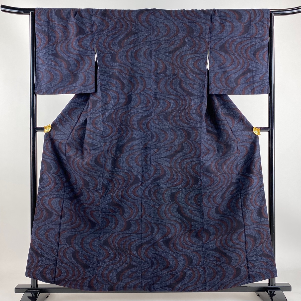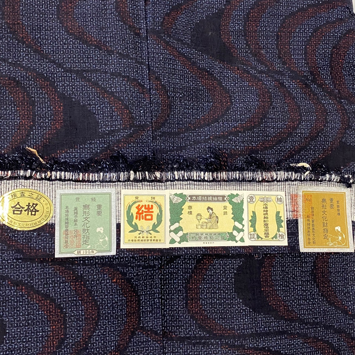 | 結城紬 逸品 証紙 本場結城紬 井上商事 流水 亀甲絣 紺色 袷 身丈157.5 裄丈66 M 正絹 【中古】 |