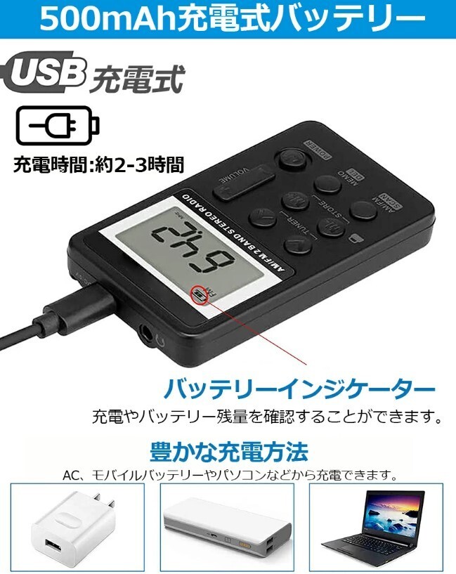 【USB充電式】:従来電池式のラジオと比べて、USB充電式で、電池の交換は必要ない、長期で便利に使用でき、パソコン、モバイルバッテリーやアダプターなどから簡単に充電できます。約2-3時間充電で10-13時間連続使用可能