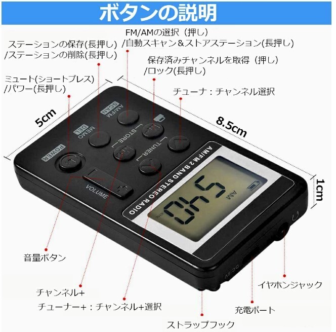 【ポケットラジオ】:コンタクトなサイズ、イヤホーン付属、電車などの公共場所に適用するポータブルラジオです。簡潔なデザイン、余計な機能がない分ボタンがシンプル、LCD大画面つきで非常に見やすいです。 コンパクなのでバッグの中に入れたままでもブラインド操作が容易。ご注意:ラジオの信号は場所によって、信号の強弱性が違います。電源ボタンを長押しでオン/オフ切り替えます。