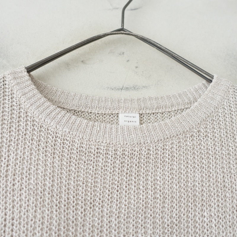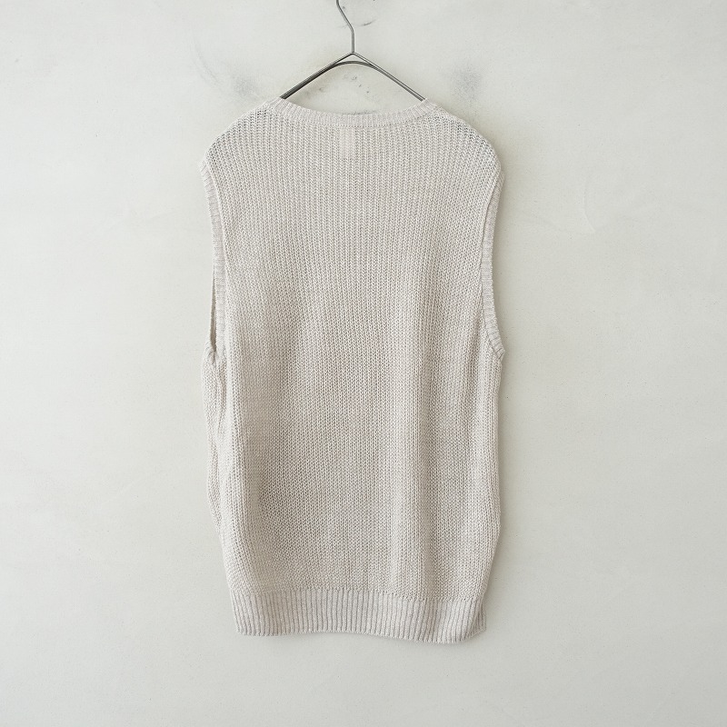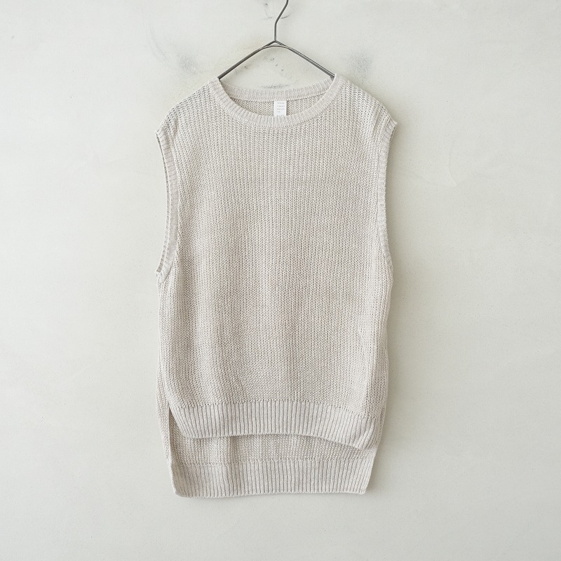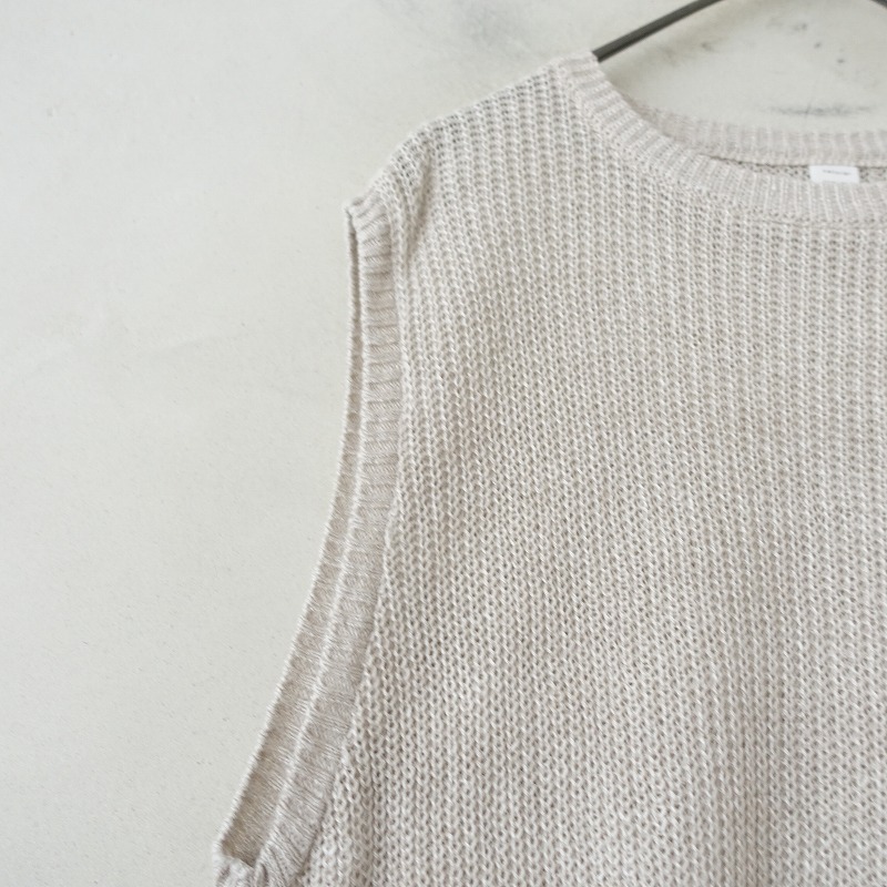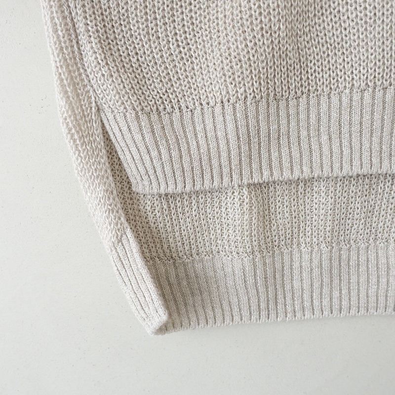 noflのリネンニットベストです。カラーはベージュ、透け感のあるニット素材で、プルオーバータイプです。襟ぐり&袖口&裾はリブ仕様で、裾両サイドにスリットが施され、着丈に前後差のあるデザインです。 |