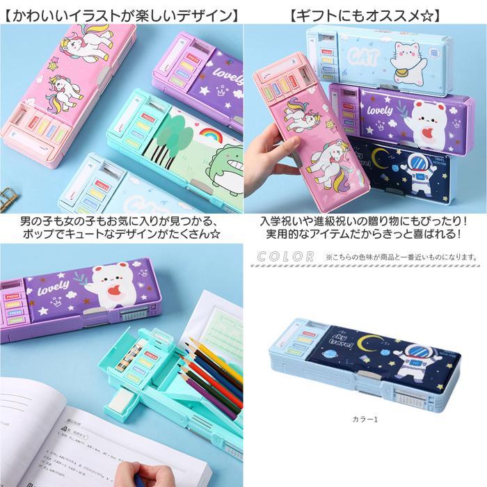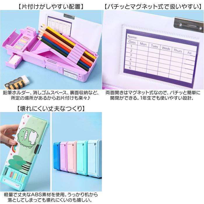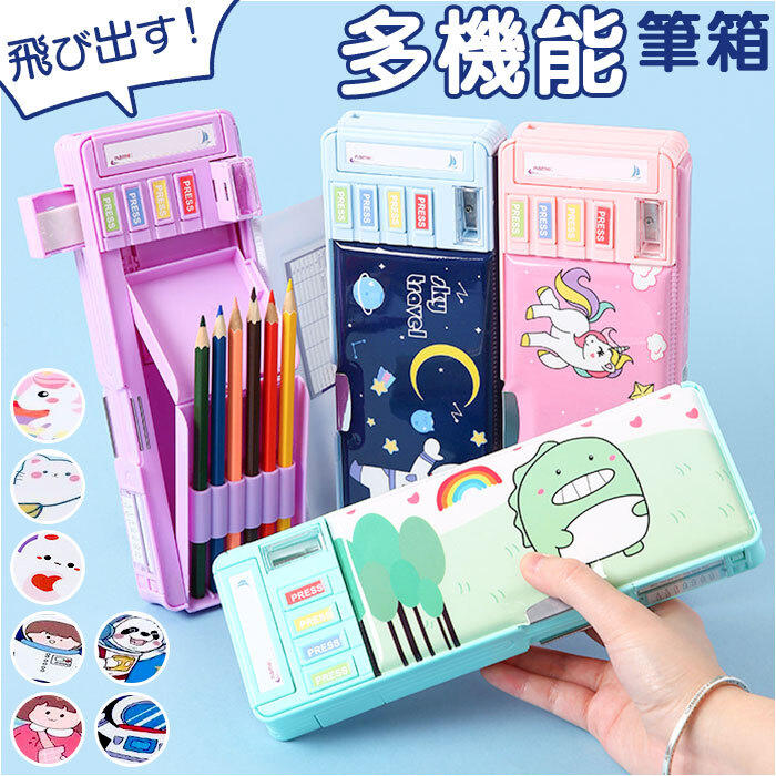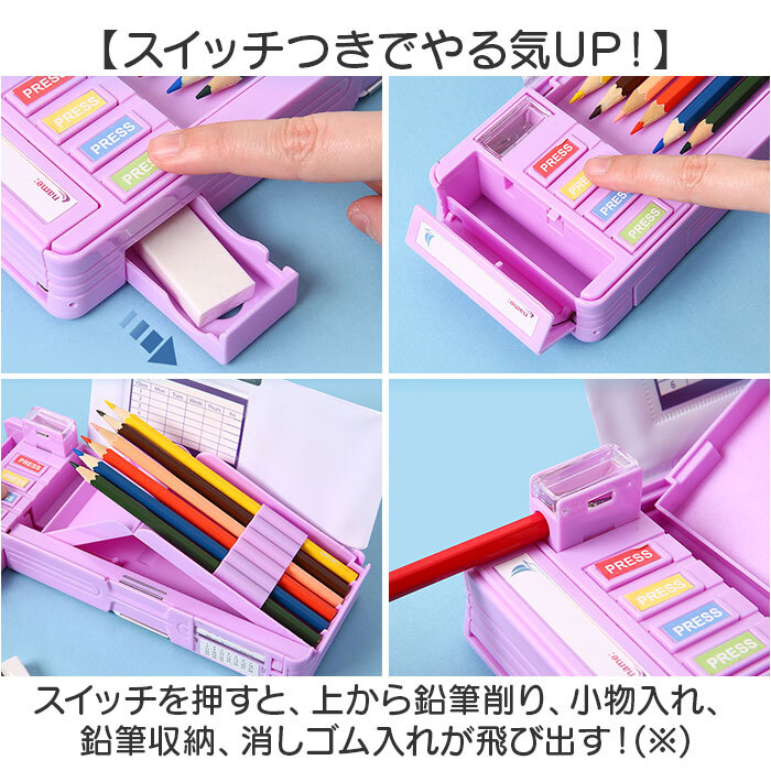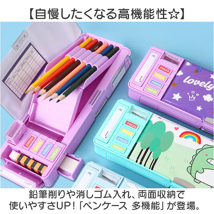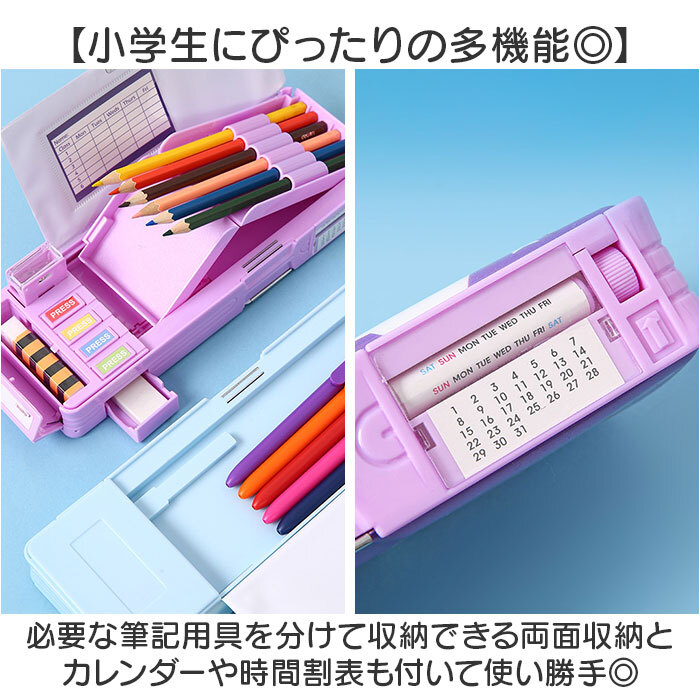 商品説明 | ・・【自慢したくなる高機能性☆】 ・鉛筆削りや消しゴム入れ、両面収納で使いやすさUP!「ペンケース 多機能」が登場。 ・【小学生にぴったりの多機能◎】 ・必要な筆記用具を分けて収納できる両面収納とカレンダーや時間割表も付いて使い勝手◎ ・【スイッチつきでやる気UP!】 ・スイッチを押すと、上から鉛筆削り、小物入れ、鉛筆収納、消しゴム入れが飛び出す! ・(※)勢いよく飛び出ますので、スイッチを押す際はご注意ください。 ・【片付けがしやすい配置】 ・鉛筆ホルダー、消しゴムスペース、裏面収納など、所定の場所があるからお片付けも楽々♪ ・【パチッとマグネット式で扱いやすい】 ・両面開きはマグネット式なので、パチッと簡単に開閉ができる。1年生でも使いやすい設計。 ・【壊れにくい丈夫なつくり】 ・軽量で丈夫なABS素材を使用。うっかり机から落としてしまっても壊れにくいのも嬉しい。 ・【かわいいイラストが楽しいデザイン】 ・男の子も女の子もお気に入りが見つかる、ポップでキュートなデザインがたくさん☆ ・【ギフトにもオススメ☆】 ・入学祝いや進級祝いの贈り物にもぴったり!実用的なアイテムだからきっと喜ばれる! |