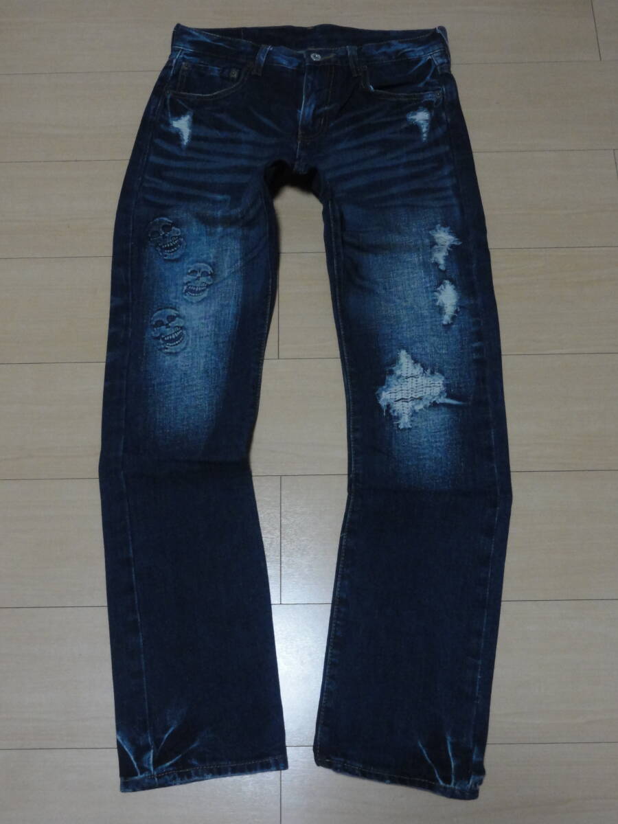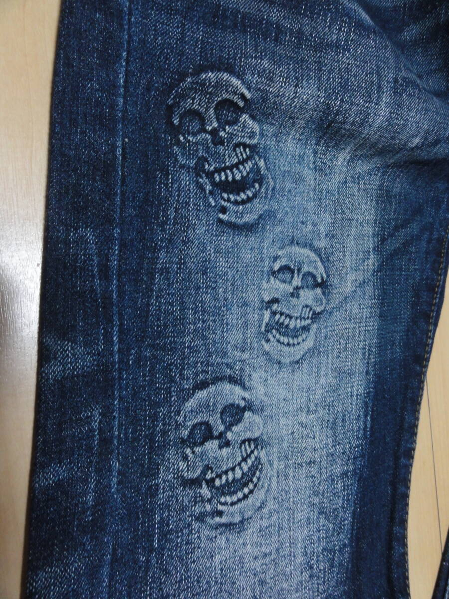 格安廃版レア・MADE IN HEAVEN(メイドインヘブン・ワールド取扱い)・ダメージ加工デニム地・立体スカル髑髏デザイン入りジーンズ Mになります。