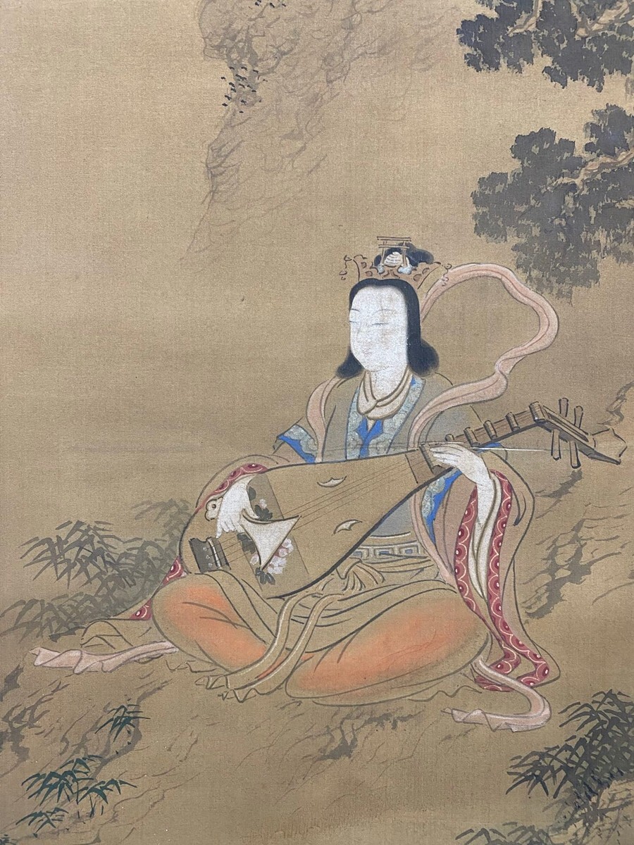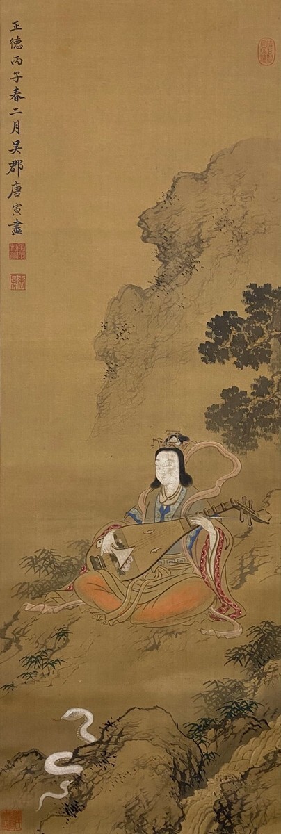 【瓏】「唐寅作 人物図」明代画家 肉筆絹本 掛け軸 書画立軸 巻き物 中国書画 古美術 蔵出