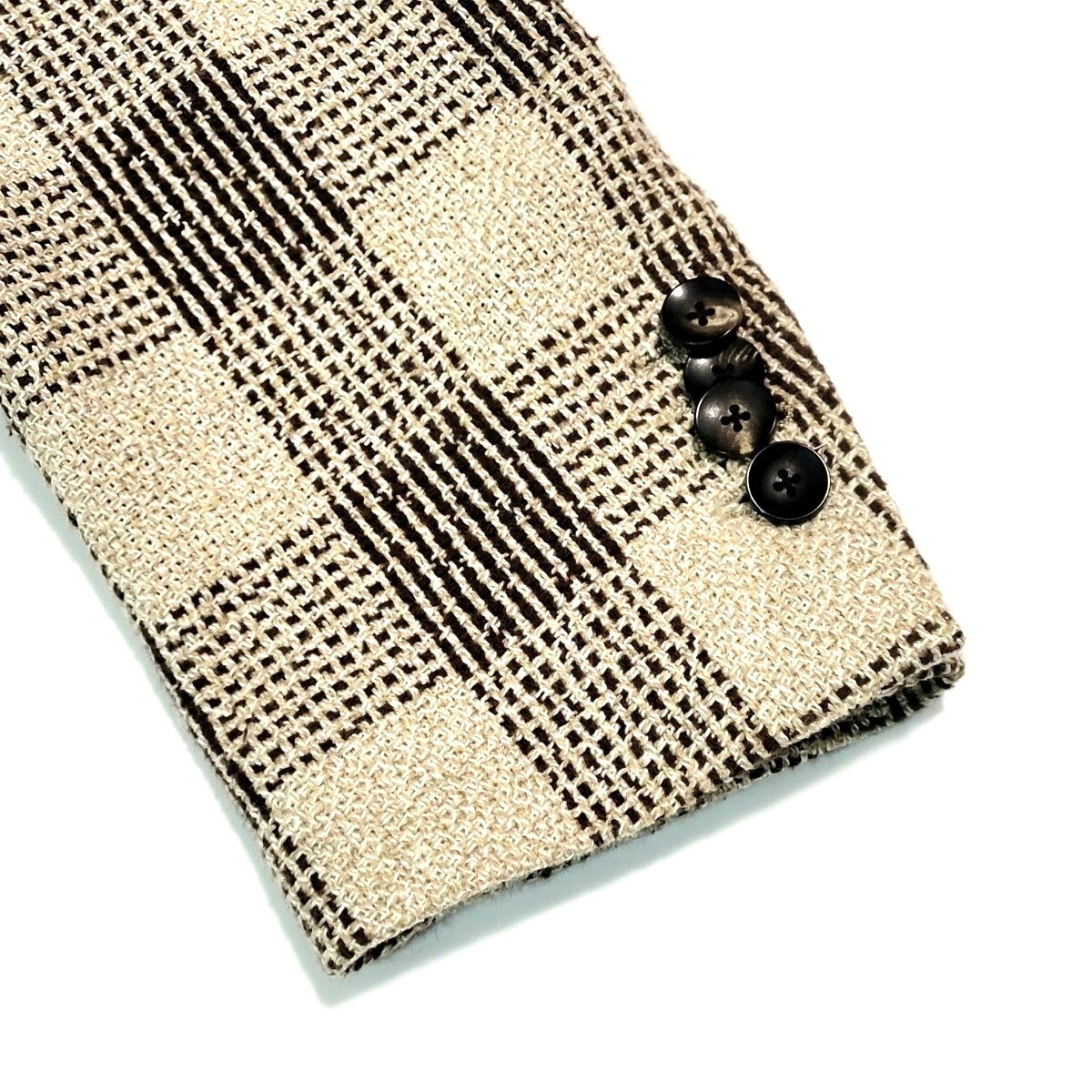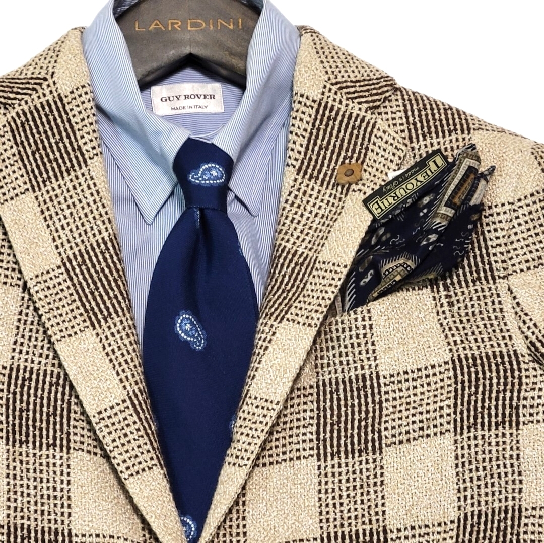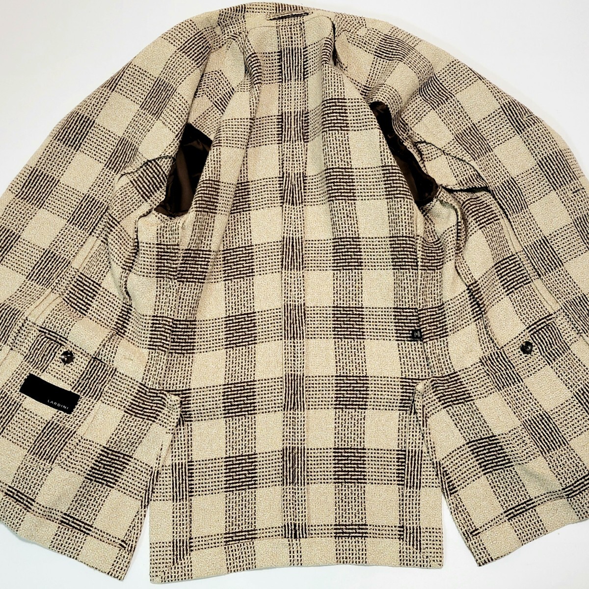 ラルディーニのシルク混のアンコン テーラードジャケットです。LARDINI(ラルディーニ)らしい、爽やかな色気とエレガンスを漂わせるエクリュカラーのジャケットは気負わずに着られるところが秀逸です。色はベージュ系、チェック。カジュアル、オフィス、着まわしがききます。大変お洒落です。ネイビーネクタイとコーデが抜群です。超高級なイタリア製、美シルエット。9回程度利用、極美品に近い部類かと思います。