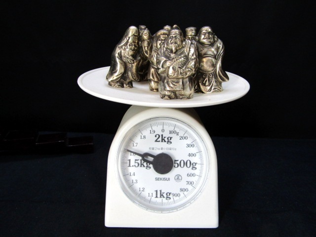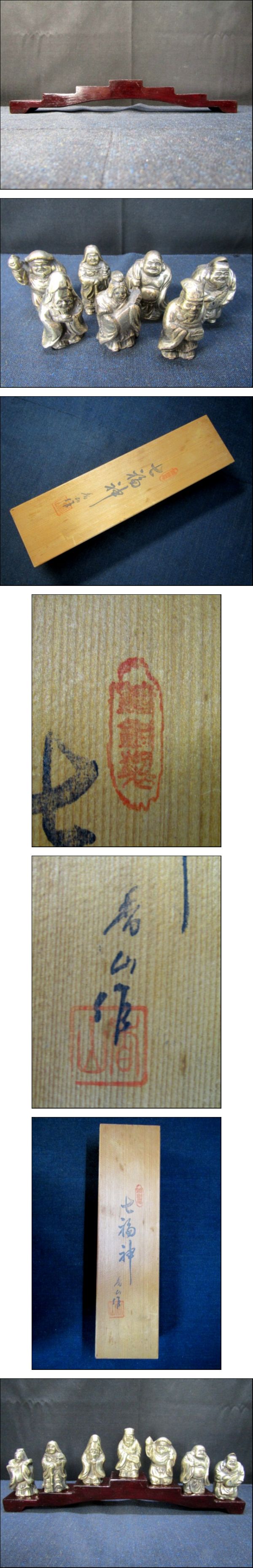 | 【蔵】★金属工芸 白銅 七福神 台付 置物 飾り 七体で重さ約 1,6㎏ 秀山作 共箱★ | ||