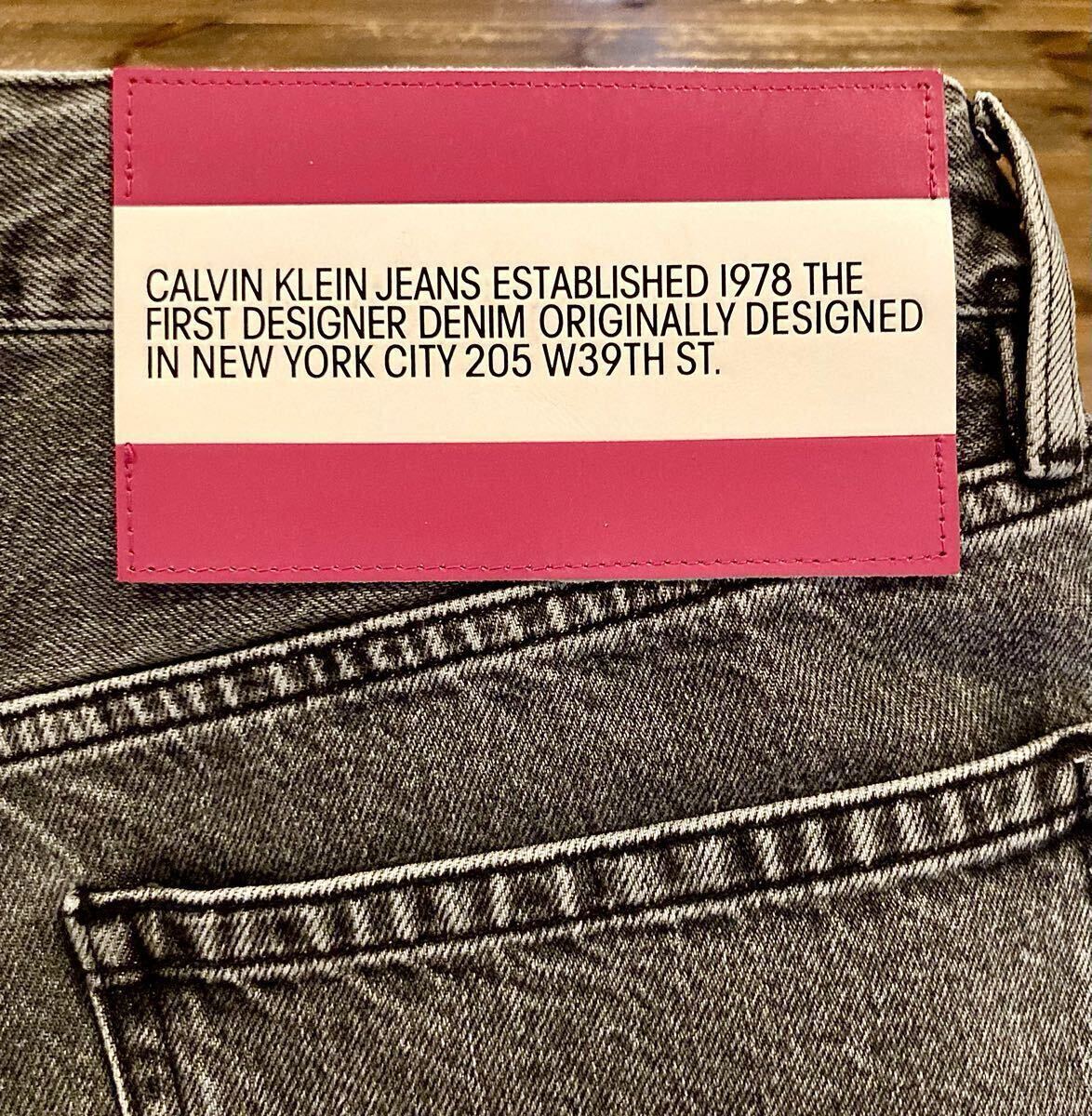 右ヒップポケット上のレザーパッチのみ主張が入り、大判のレザーをベースにカルバンクラインの歴史がレタリングされています。