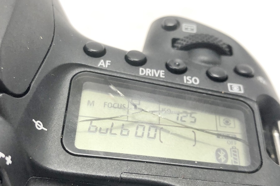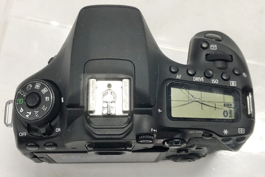 外観擦れ・傷がございます。正面ロゴ一部塗りつぶしがございます。上部液晶モニターに割れがございます。グリップにベタつきがございます。バッテリー・アイキャップが欠品しております。カード書き込み・AF/MF撮影・各ダイヤル・ボタン動作確認済みでございます。