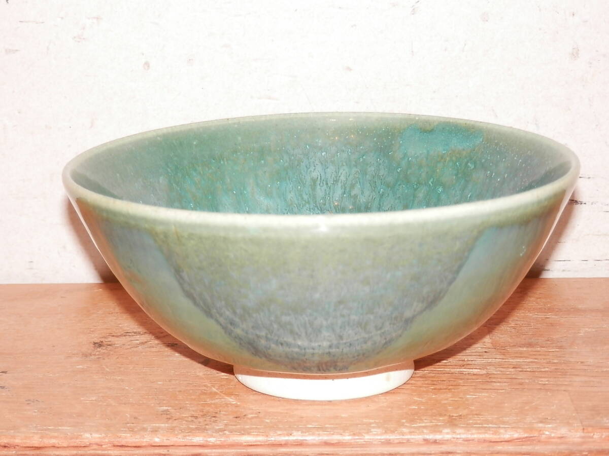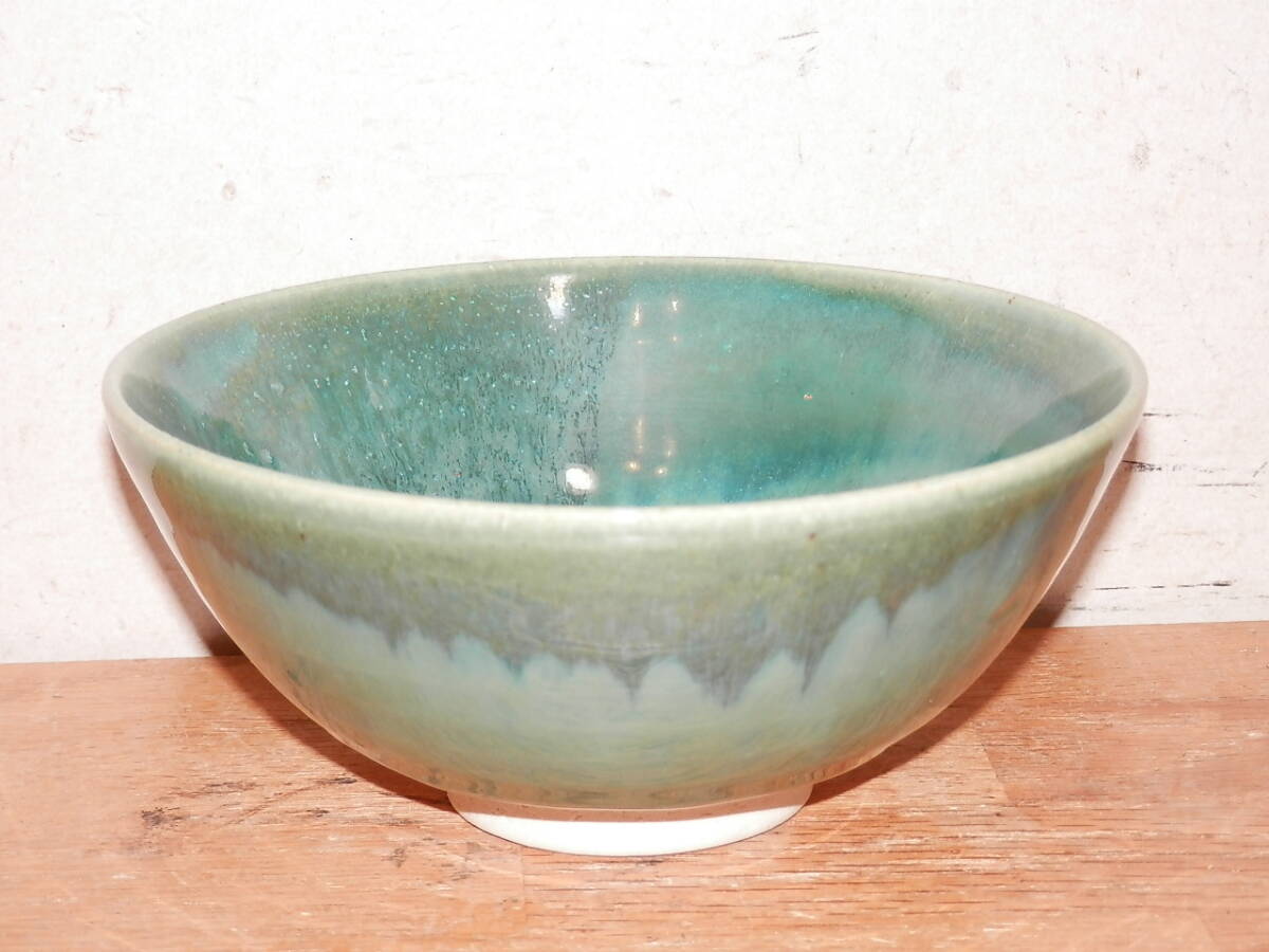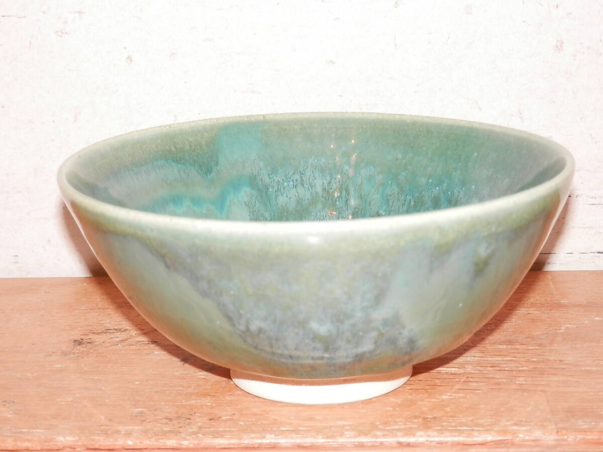 こぶ志焼 海鼠釉 茶碗 山岡三秋造 箱なし 中古 陶器 茶道具 ご飯茶碗 青系
