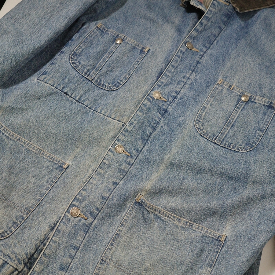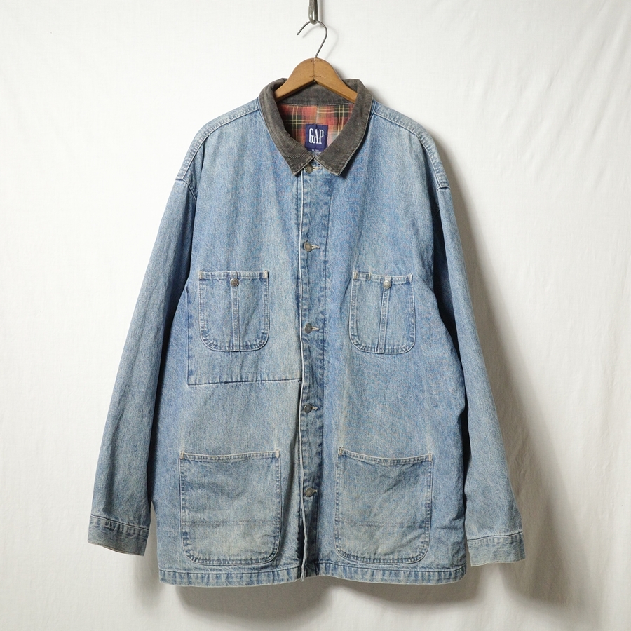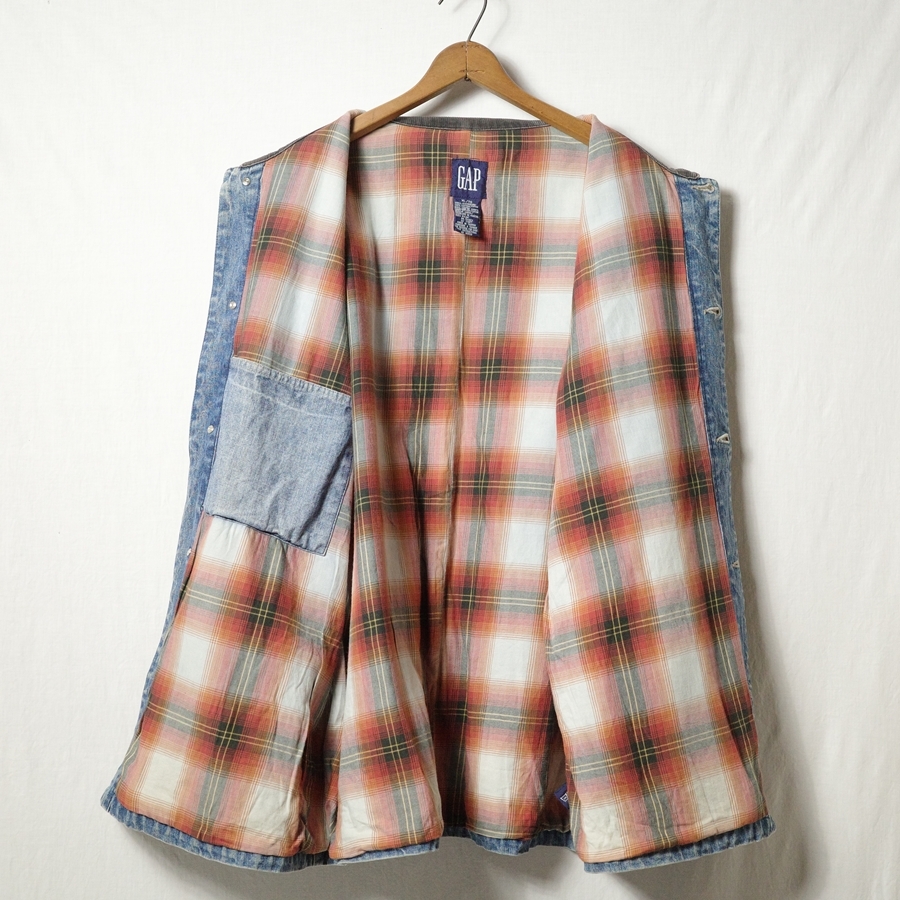 90年代頃GAPのカバーオールになります。程よい使用感で雰囲気のあるインディゴデニムにオンブレチェックのコットンライニングが付いた好デザインです。