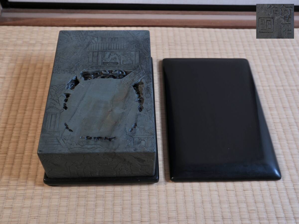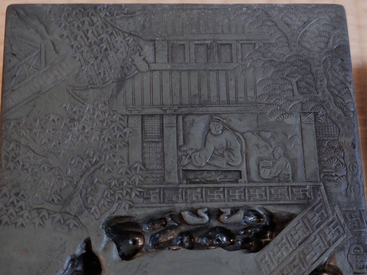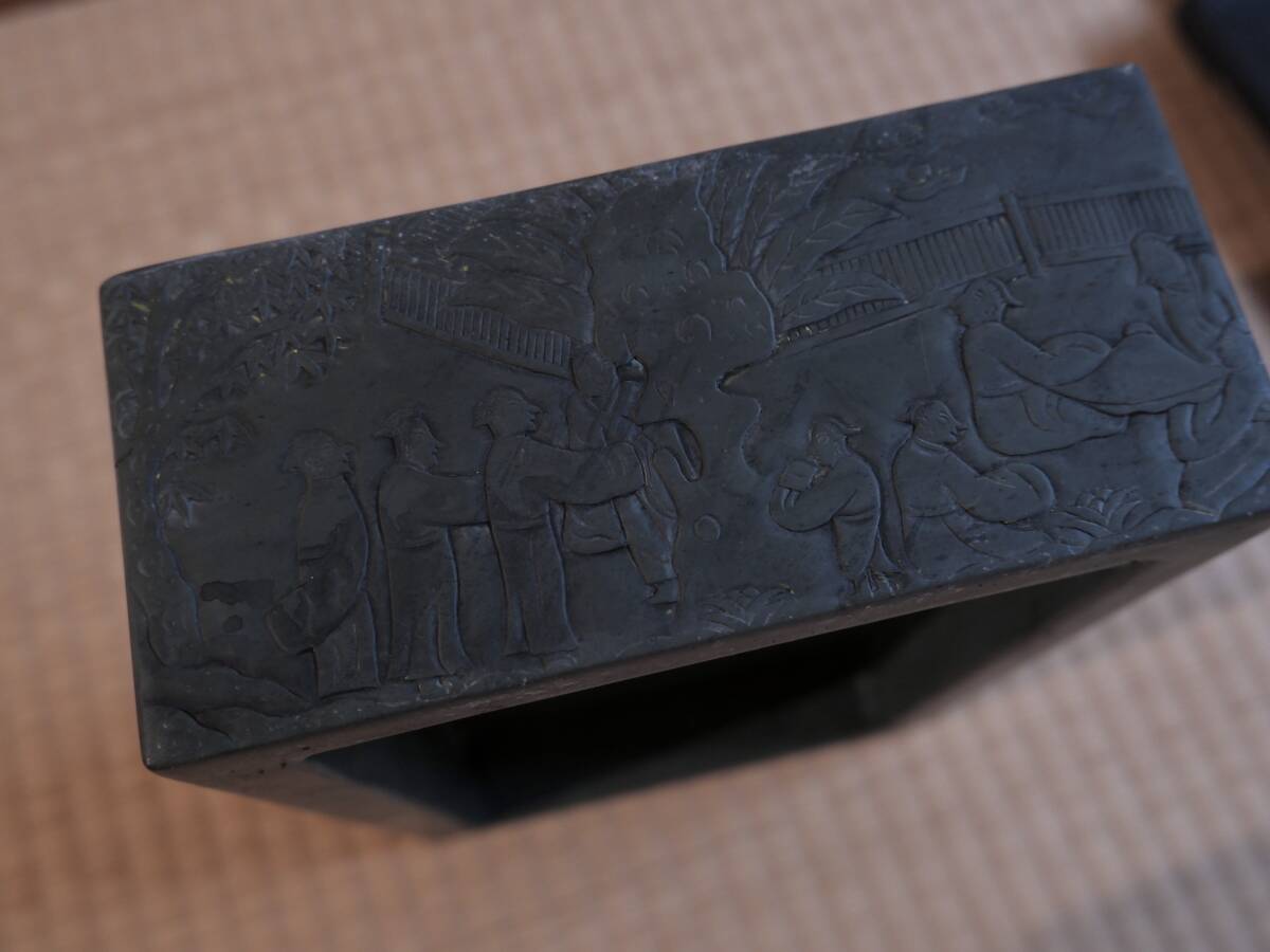 【青枠】何其仁 古硯 蘭亭硯  風景人物図 端渓硯 大型 書家の愛蔵品 約8.4㎏ 書道具 古道具 時代物 美術品Q1902