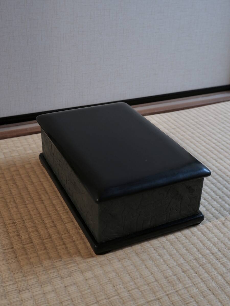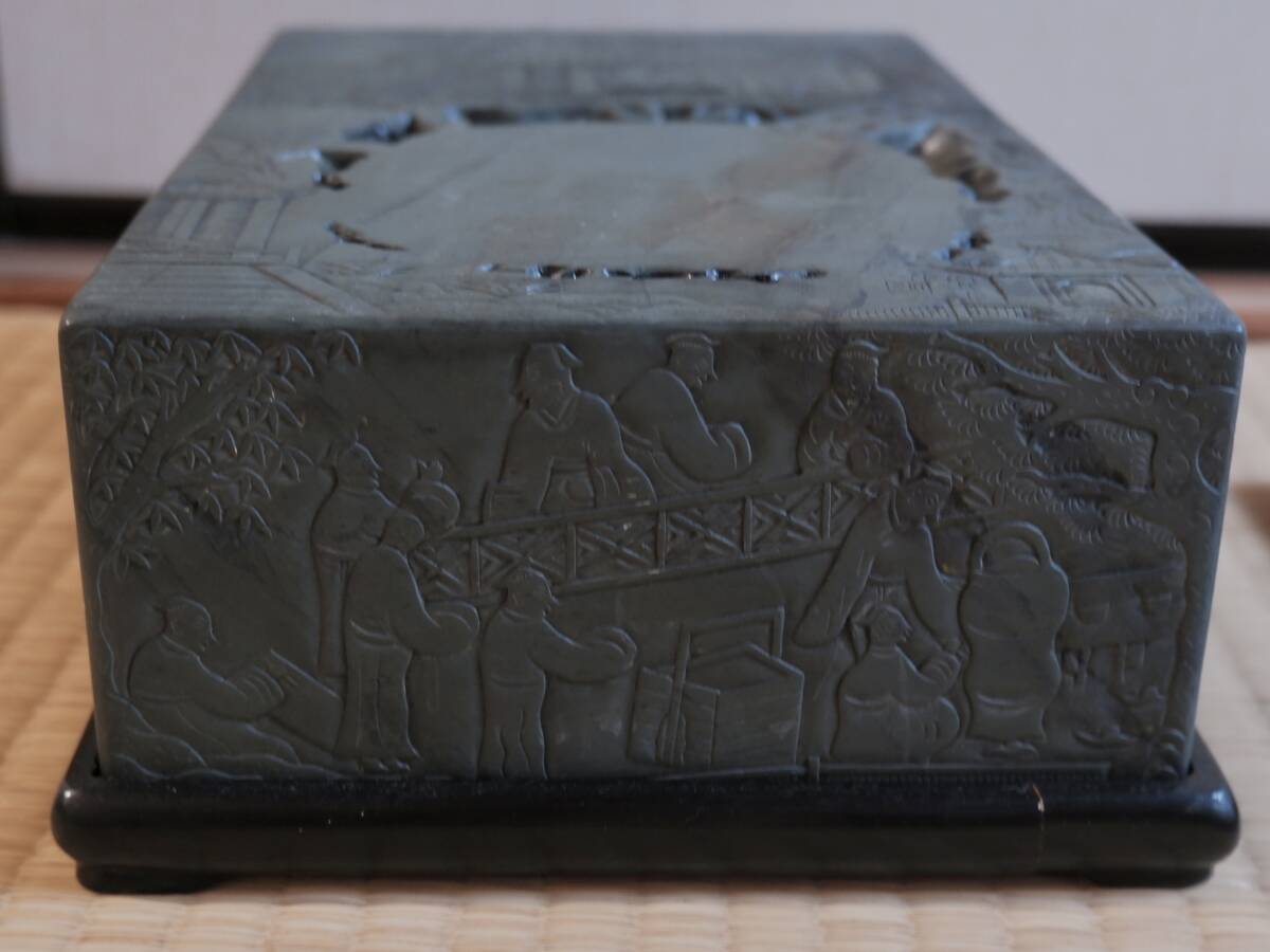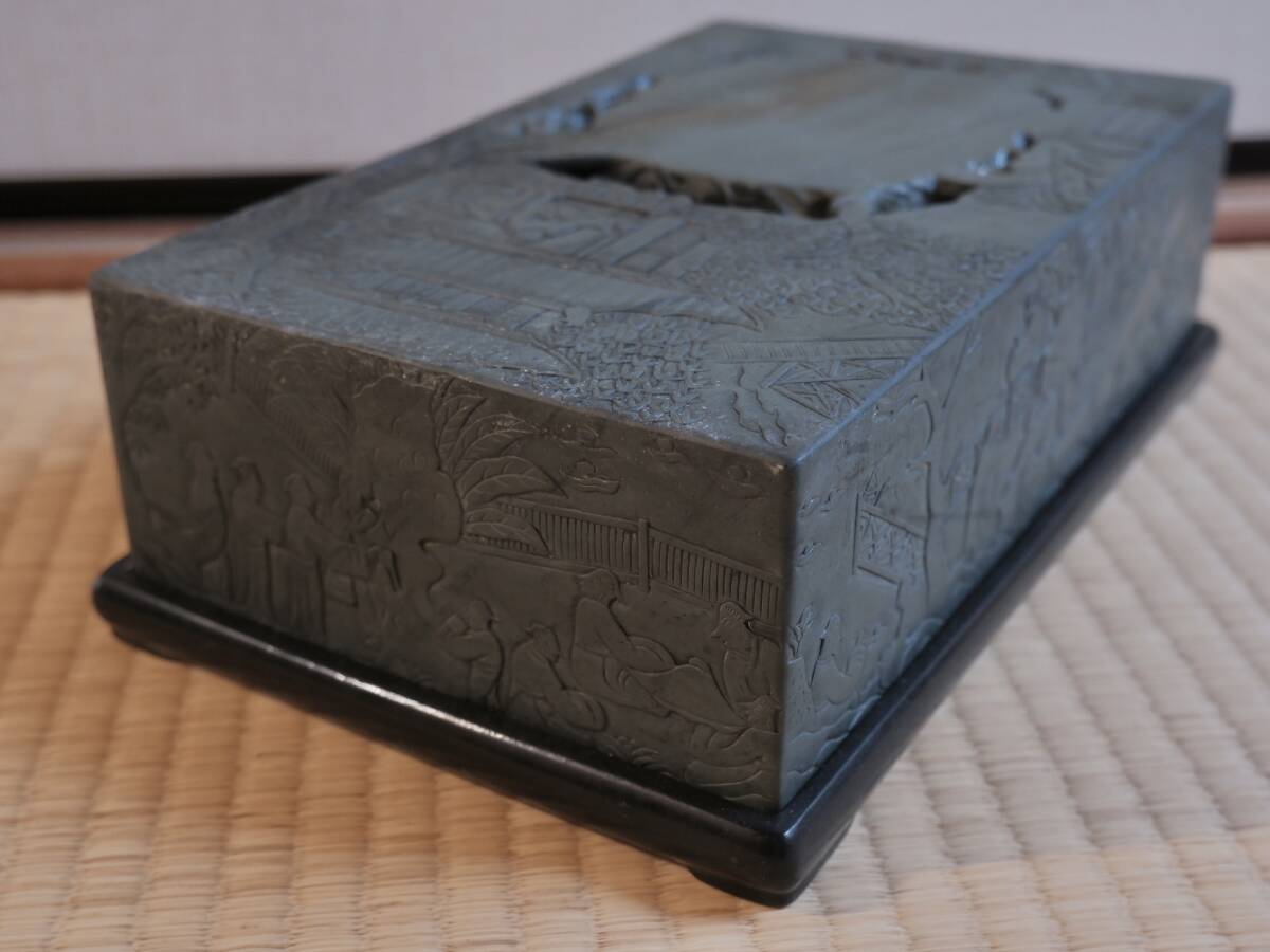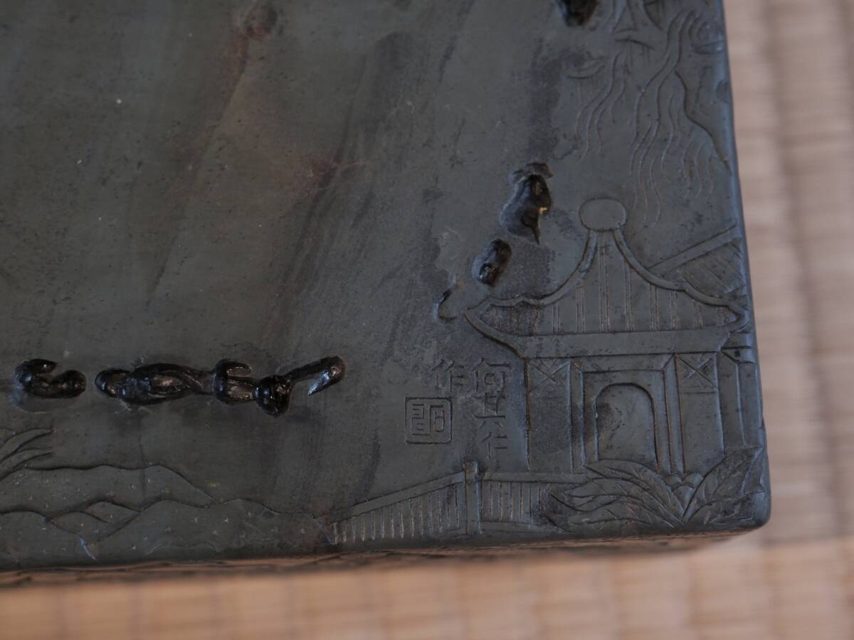 【青枠】何其仁 古硯 蘭亭硯  風景人物図 端渓硯 大型 書家の愛蔵品 約8.4㎏ 書道具 古道具 時代物 美術品Q1902