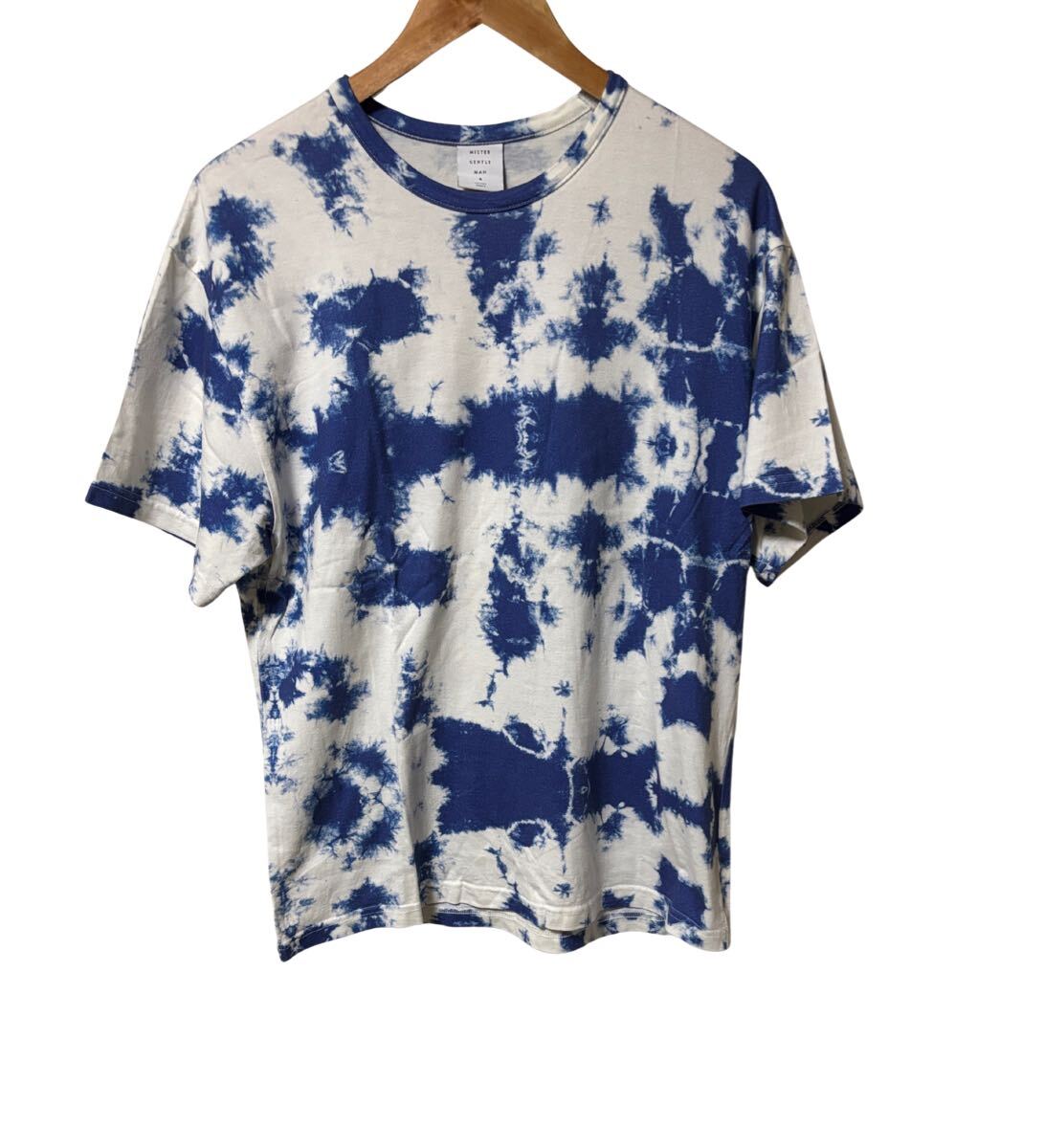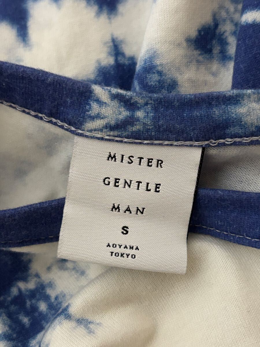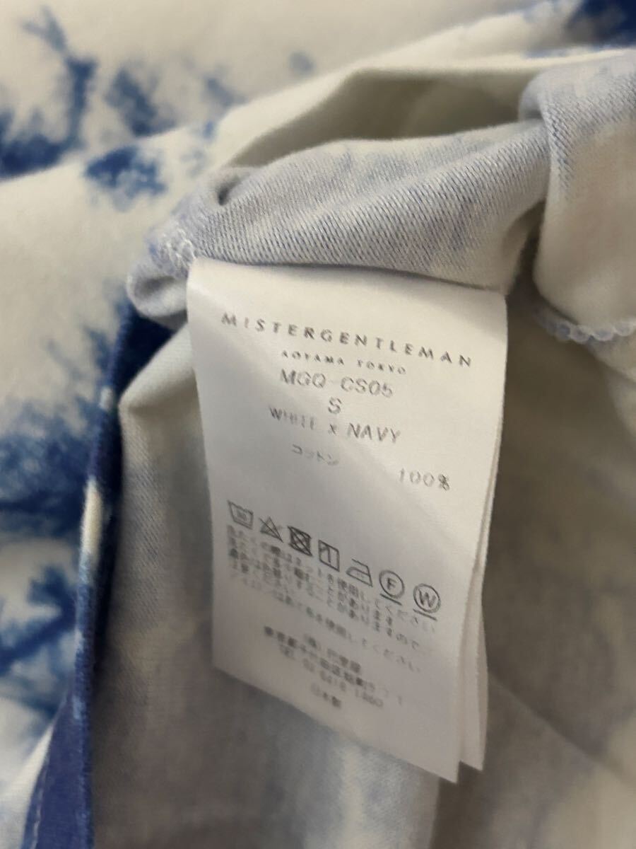 Thank you for visiting. This is a tie-dye T-shirt from the Tokyo-based fashion brand MISTERGENTLEMAN, in size S, color white × navy. Made of 100% cotton, it features a unique tie-dye pattern that gives each piece its own one-of-a-kind look.