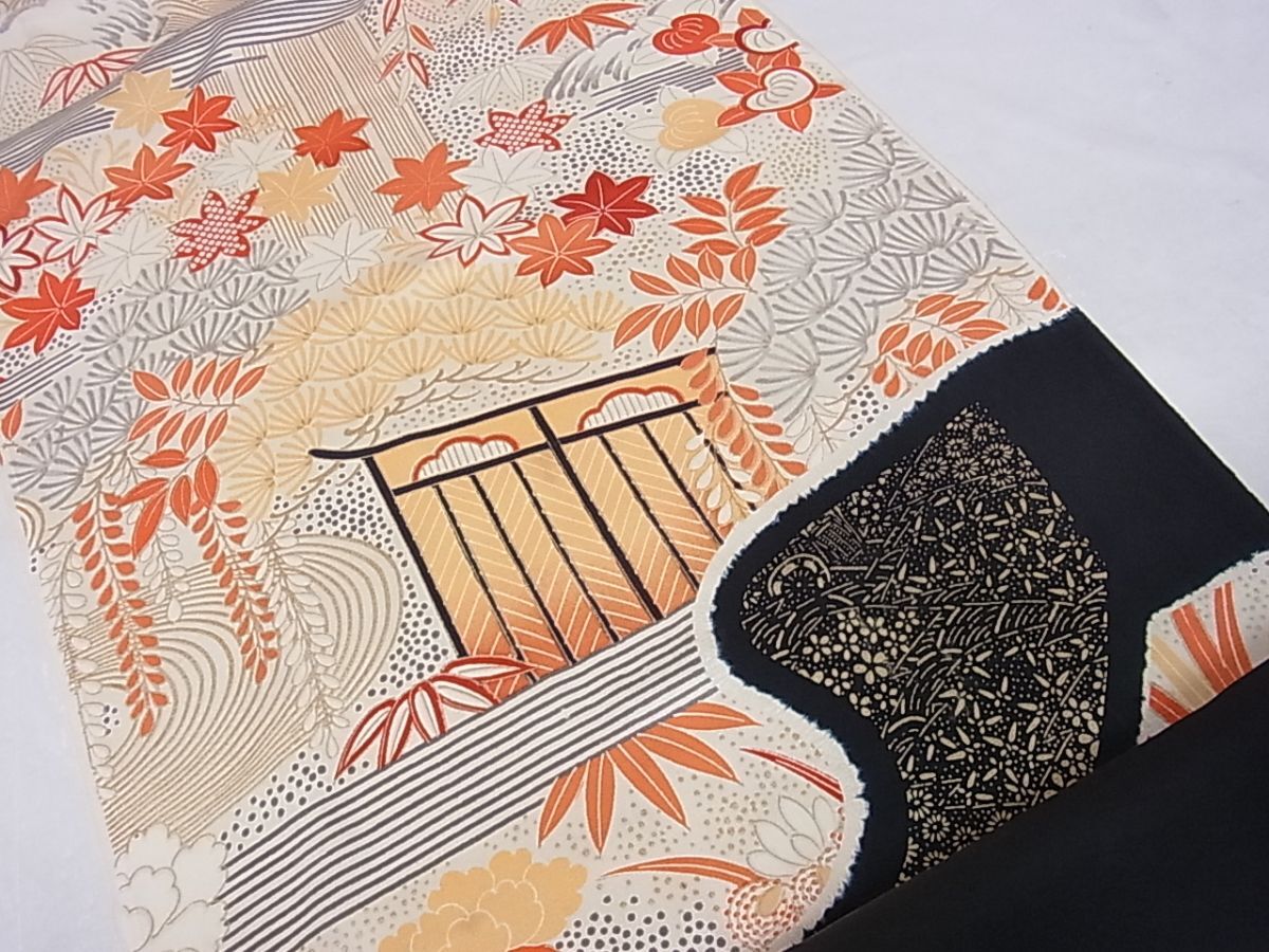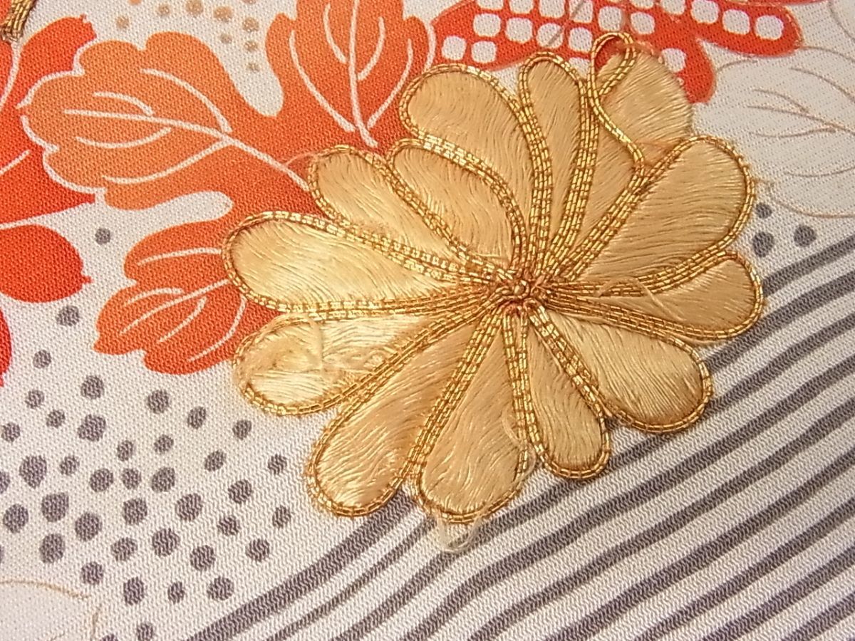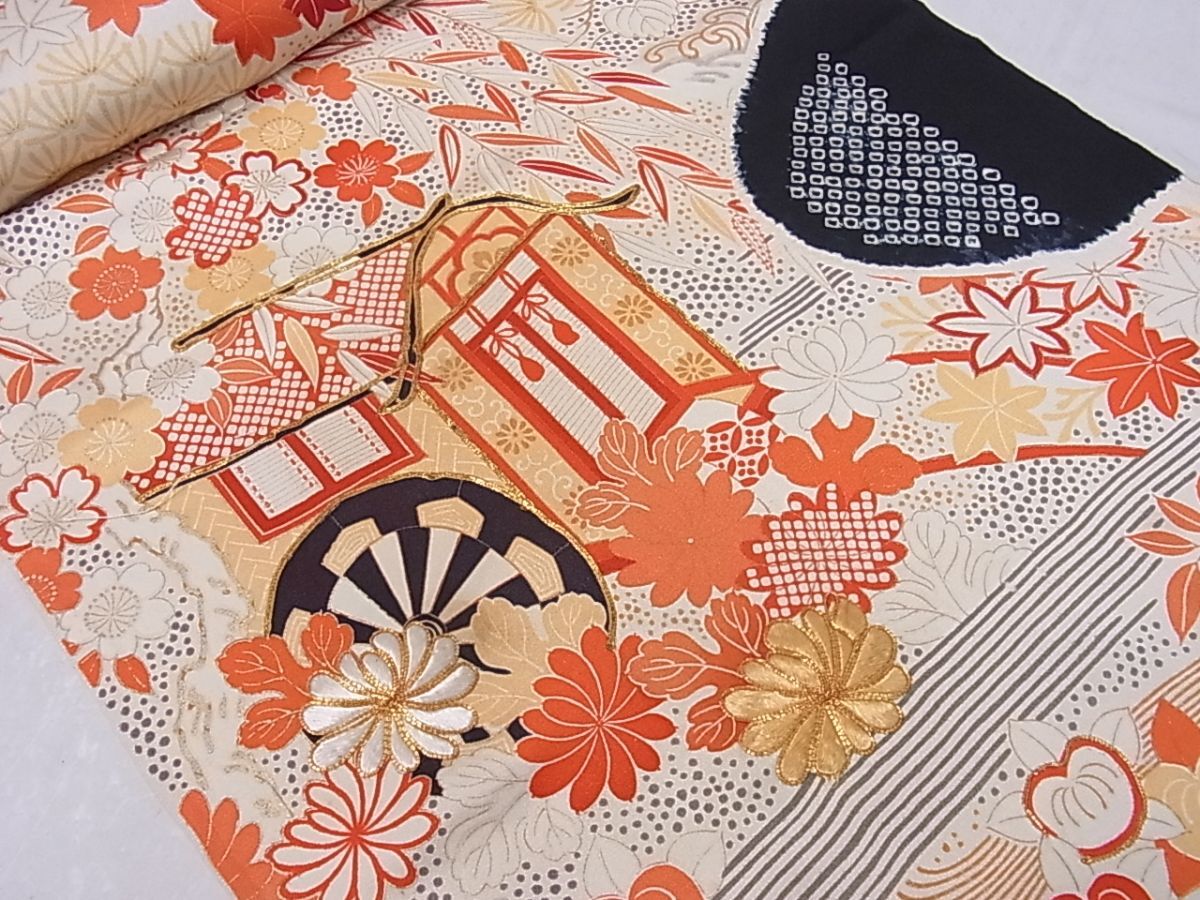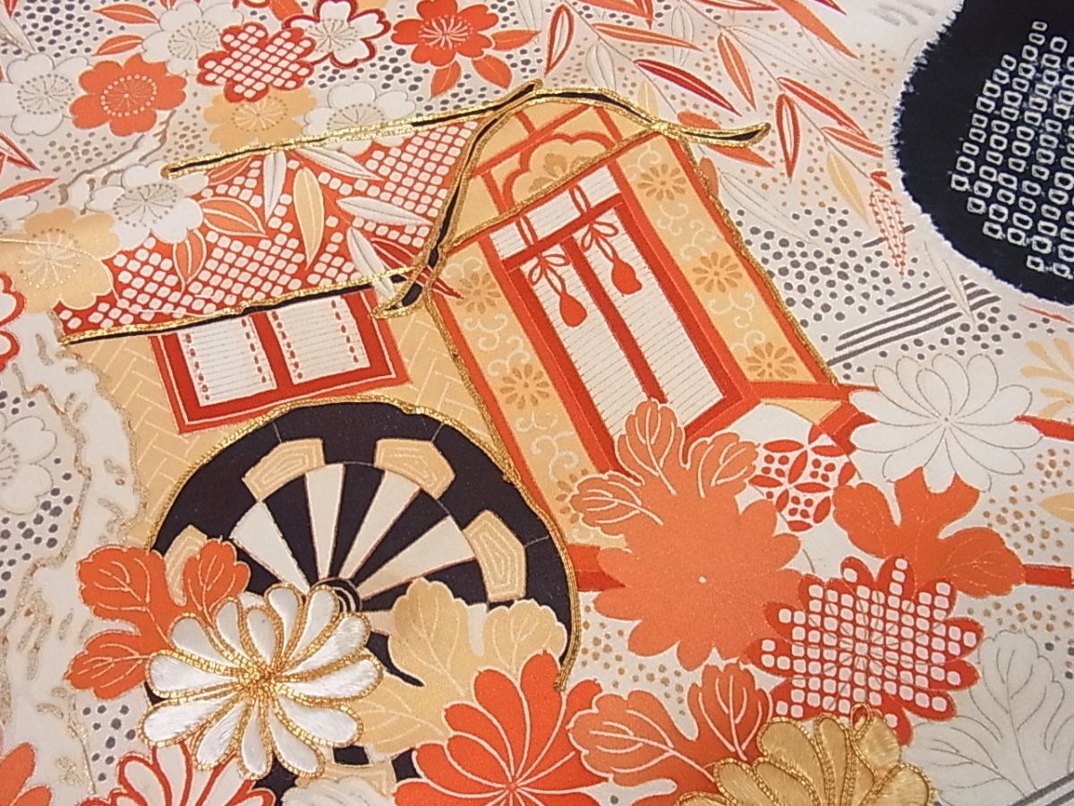 eふれんず◆振袖 反物 解き反物 着尺 駒刺繍 御所車風景花文 金彩 正絹 未仕立て◆bm1541