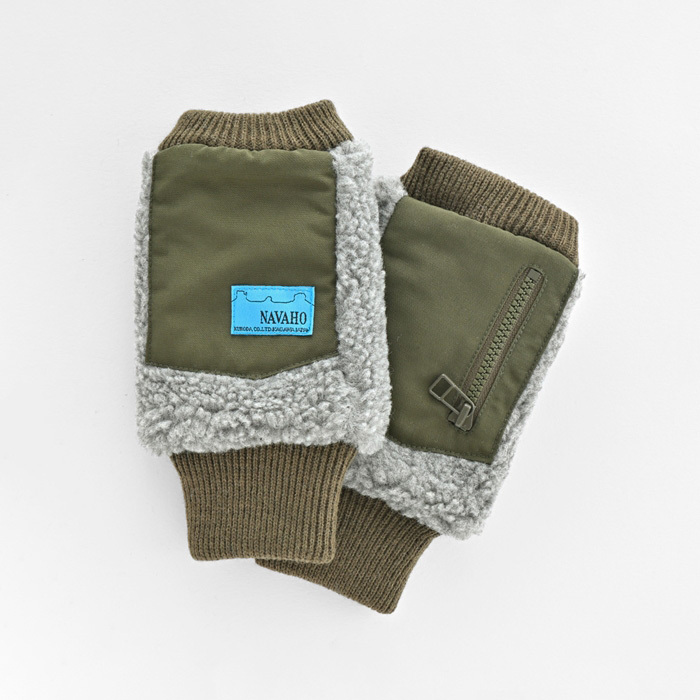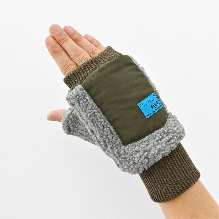 素材 | 甲部:「パイル」アクリル100% 、「グラッド」アクリル・ポリエステル 掌部:ポリエステル100%/ニット部:毛・ナイロン/ナイロン部:綿・ナイロン/裏地:極薄ボア |