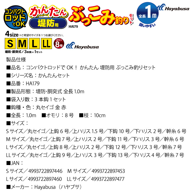 | 商品名 | コンパクトロッドでOK かんたん 釣り 堤防用 ぶっこみ釣りセット LLサイズ HA179 袋入り数3本鈎1セット 仕掛け ハヤブサ | ||||||||||