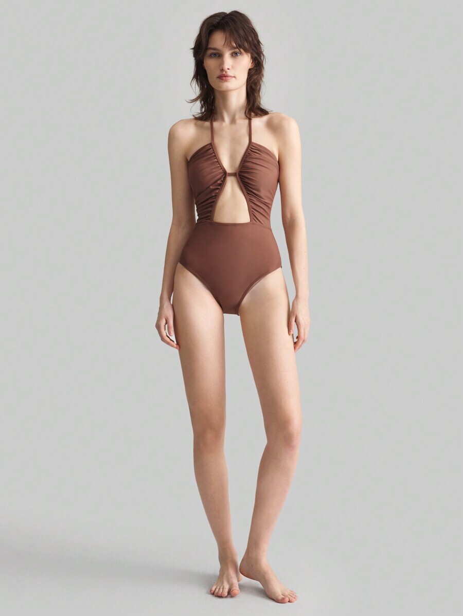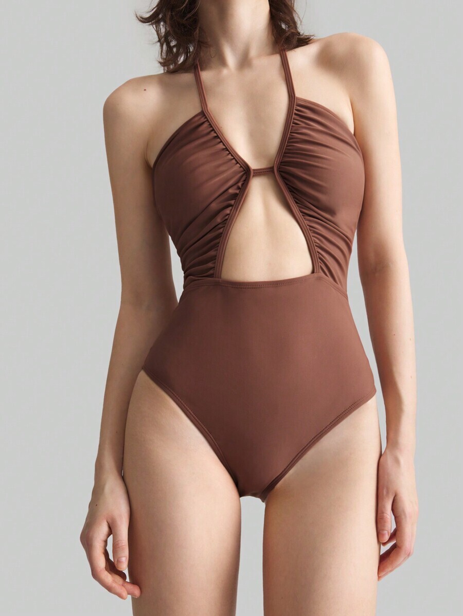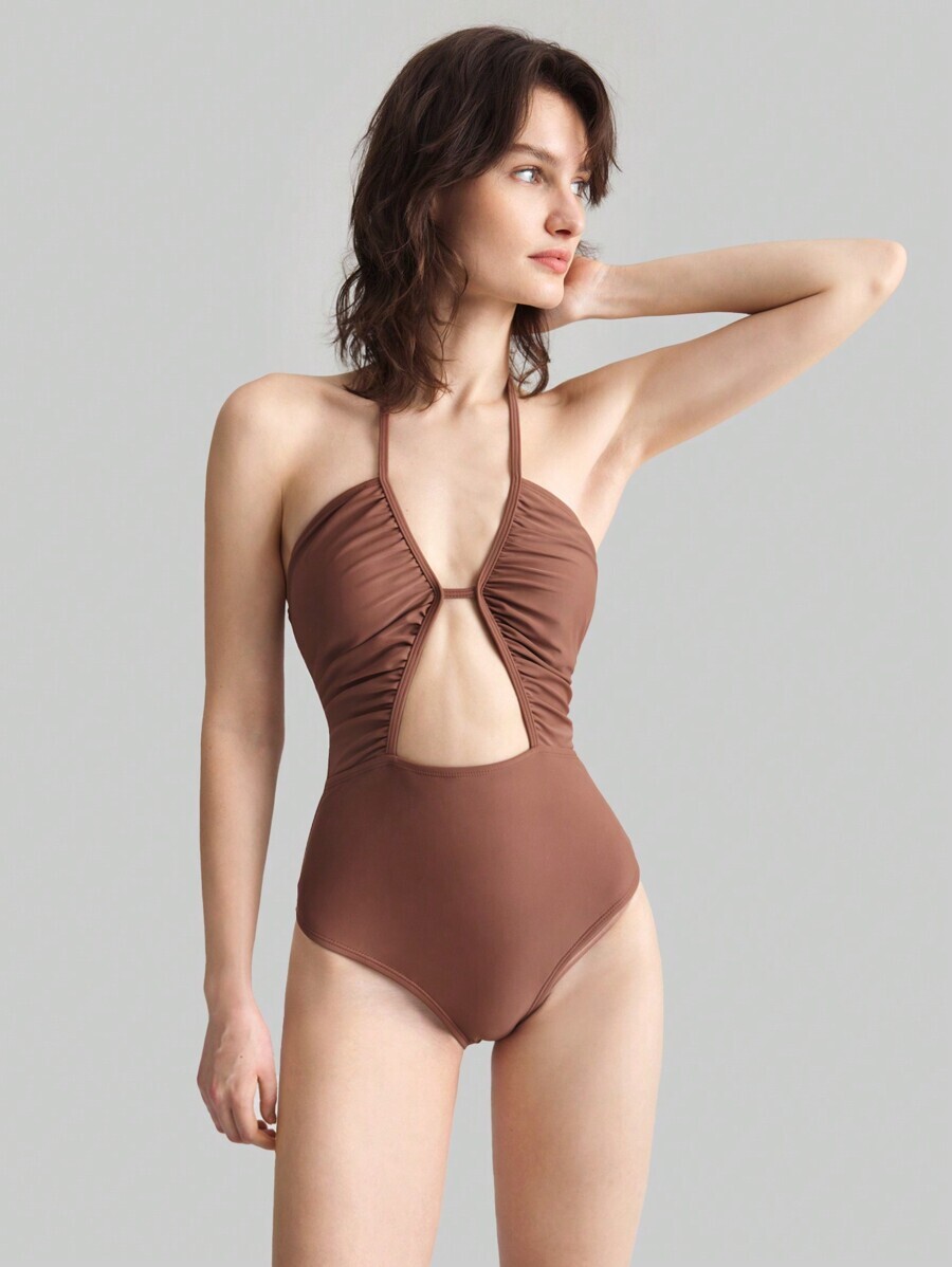 レディース 水着 ワンピース チョコレート色の四季通用ビーチバケーション シンプルなバックレスホルターネック ワンピース水着、プリ
