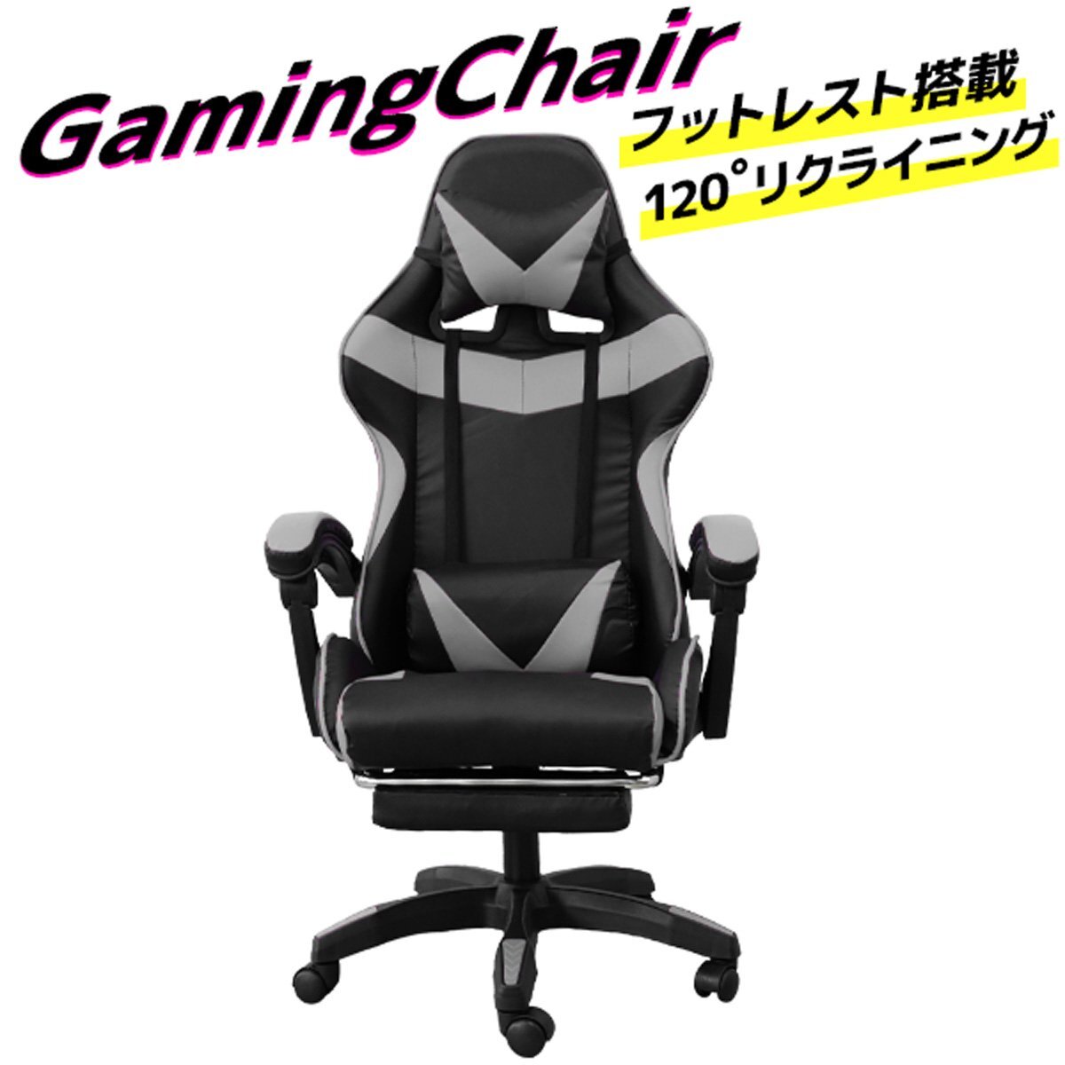 ゲーミングチェア グレー 120度 リクライニング使用 フットレスト付き 合成レザー素材を使用したゲーミングチェア。 足先までゆったりくつろげる、フィット感抜群のゲーミングチェアです。 体をすっぽり包み込むバケットシートデザインで、綺麗な姿勢を保ちます。 頭部と腰部をサポートするクッション付きで、長時間座りっぱなしでも疲れにくいフィット感です。 背もたれは最大約120度まで、座面の高さは最大約13cmまで スムーズに調節できます。 |