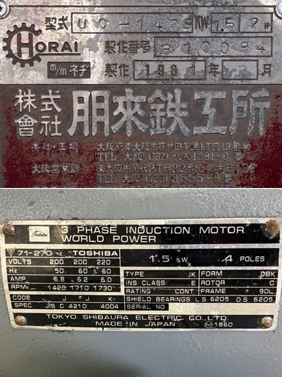 規格・仕様 | 【仕様】 ・電源:三相200V ・モーター:1.5kW 2馬力 ・製造年:1981年 ・全体寸法:L800*W450*H1380mm |
