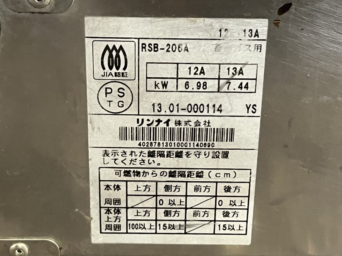 Rinnai リンナイ 業務用ガスコンロ 都市ガス RSB-206A 2013年製 二口