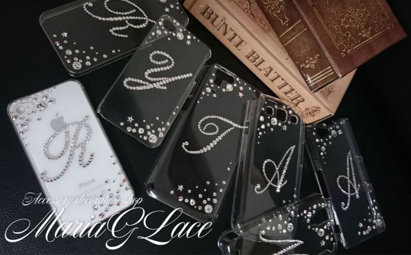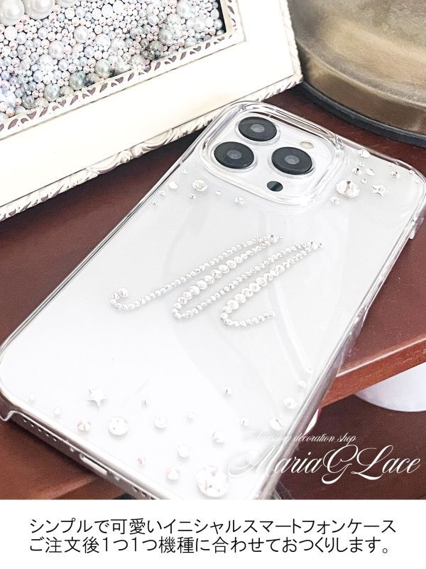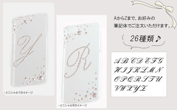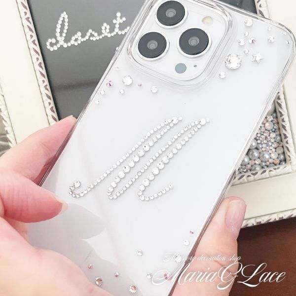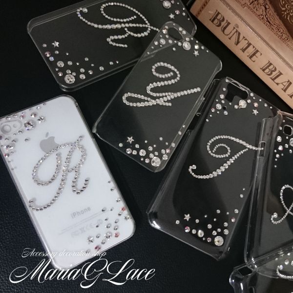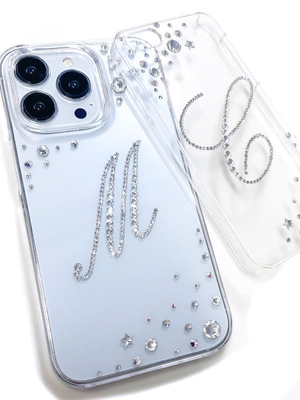 クリアケースに大きめの筆記体イニシャルと、まわりにクリスタルストーンをちりばめました。