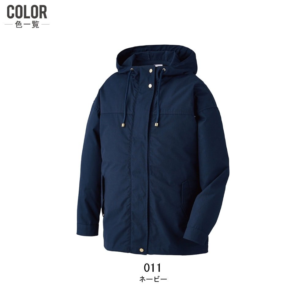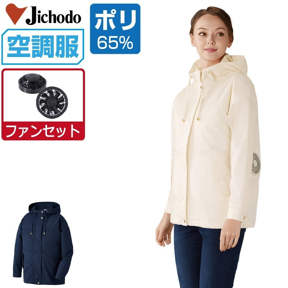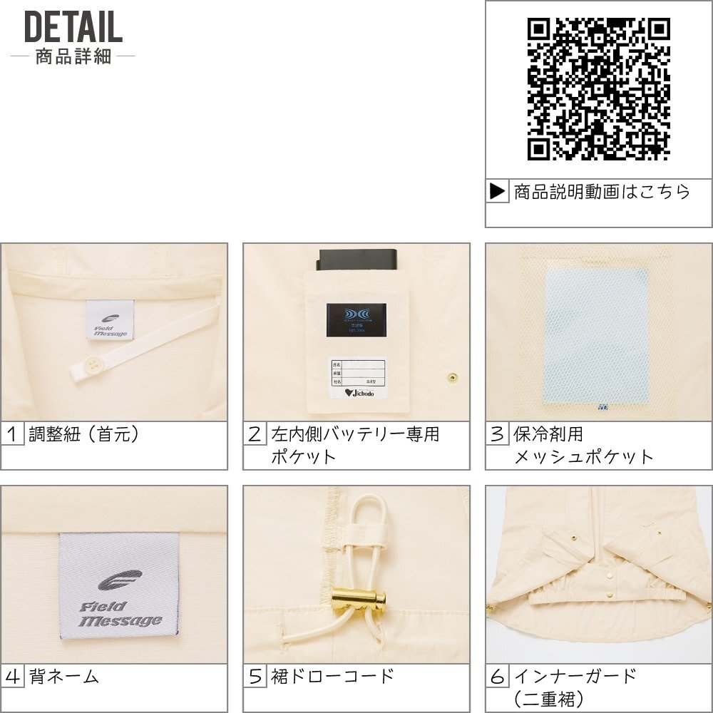 特長:UVカット/調整紐(首元)/左内側パッテリー専用ポケット/保冷剤用メッシュポケット/裾ドローコード/インナーガード(二重裾)