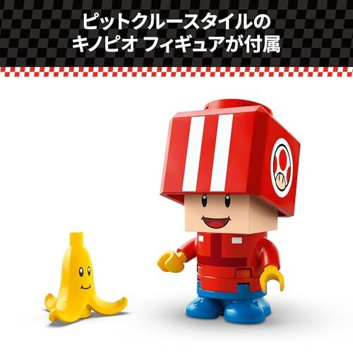 キノピオ(ピットクルー)が大活躍 赤いピットクルーのユニフォームを着たキノピオ(ピットクルー)のフィギュアと、バナナのアイテムが付属しています