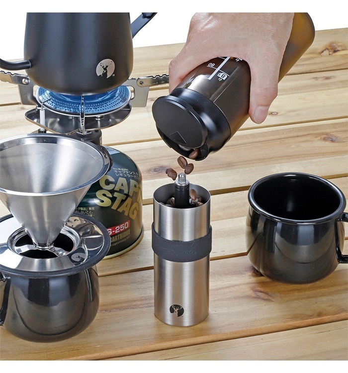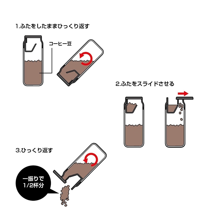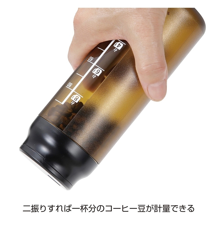 | 二振りすれば一杯分のコーヒー豆が計量できる。 便利なメモリ付き。 約9杯分のコーヒー豆を持ち運べます。 |