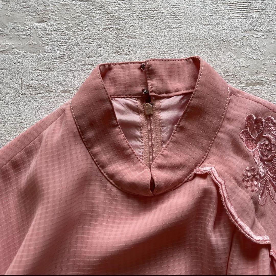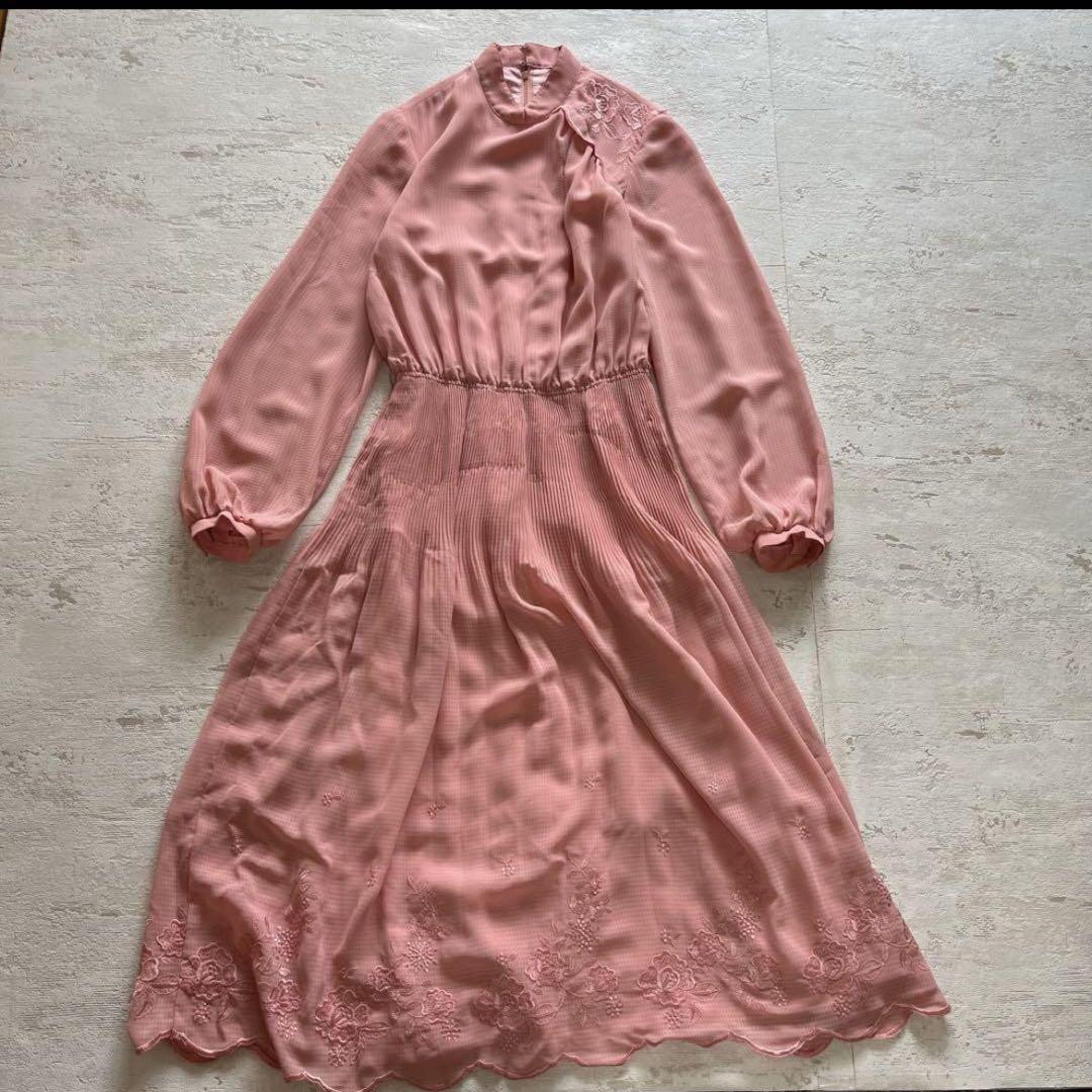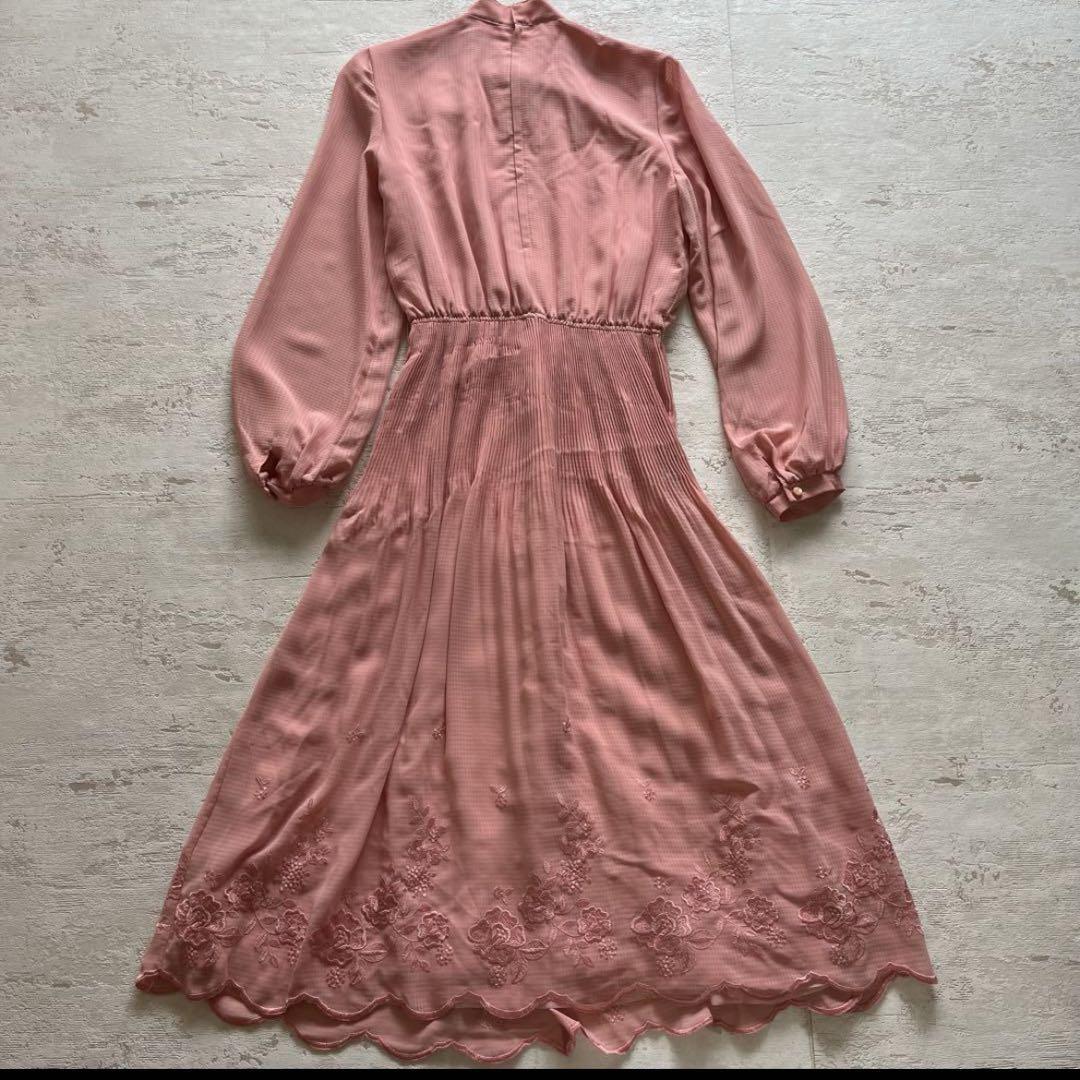 淡いピンクカラーに同系色の花柄刺繍があしらわれた、昭和レトロな雰囲気漂うロングワンピースです。上品な立ち襟デザインとウエスト切り替えでシルエットが美しく、大人かわいい印象を演出。裾や袖口の刺繍が華やかさをプラスし、秋冬のお出かけや特別な日のおしゃれにぴったりです。長袖なので季節感があり、一枚で主役になる存在感。古着女子やヴィンテージ好きの方におすすめのアイテムです。状態も比較的良好で、まだまだ着用いただけます。