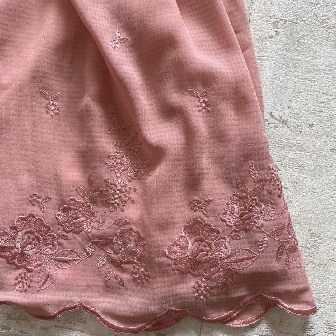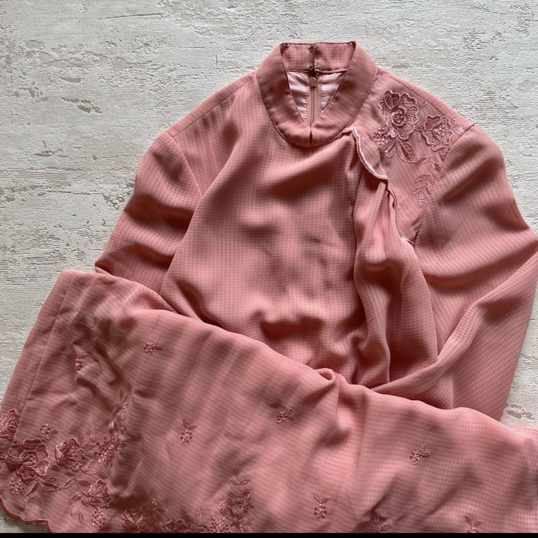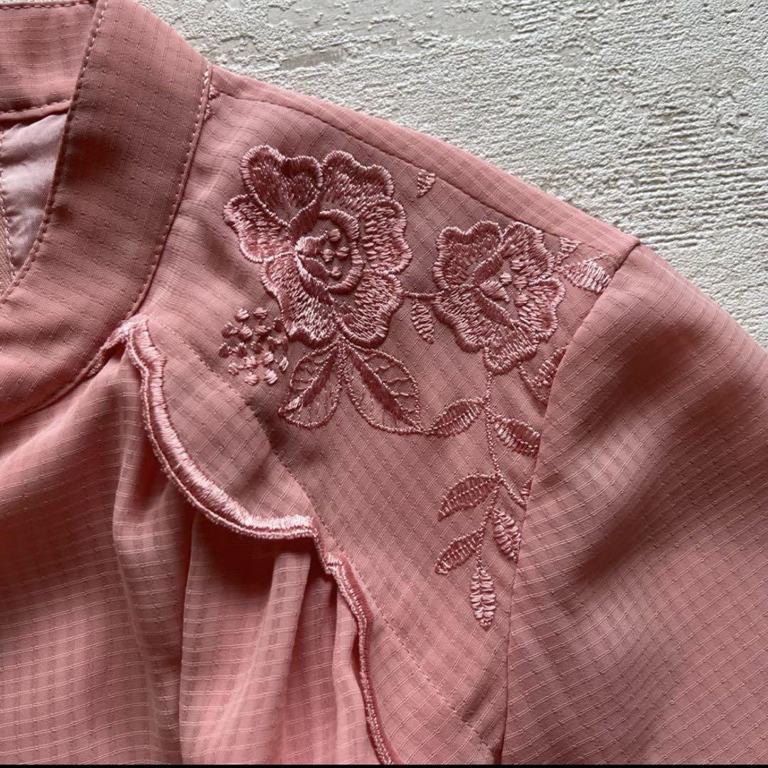淡いピンクカラーに同系色の花柄刺繍があしらわれた、昭和レトロな雰囲気漂うロングワンピースです。上品な立ち襟デザインとウエスト切り替えでシルエットが美しく、大人かわいい印象を演出。裾や袖口の刺繍が華やかさをプラスし、秋冬のお出かけや特別な日のおしゃれにぴったりです。長袖なので季節感があり、一枚で主役になる存在感。古着女子やヴィンテージ好きの方におすすめのアイテムです。状態も比較的良好で、まだまだ着用いただけます。