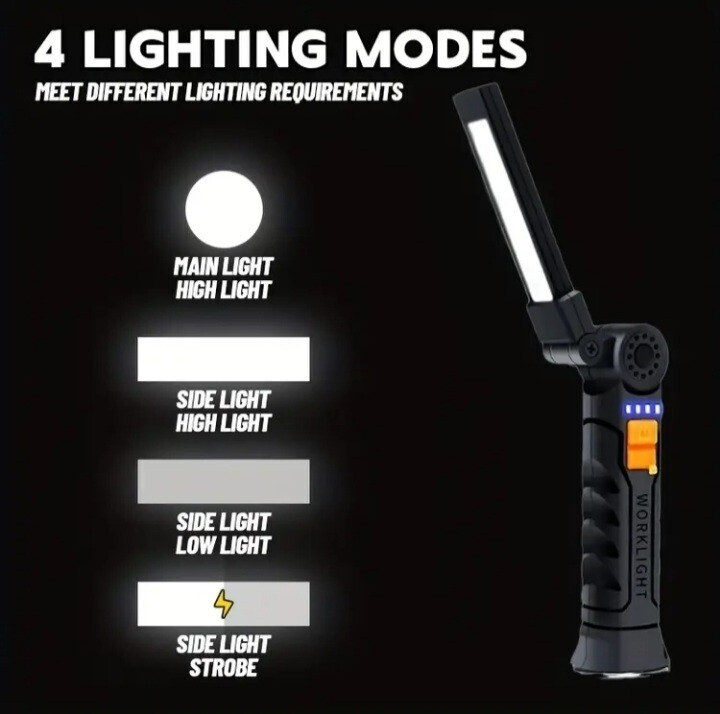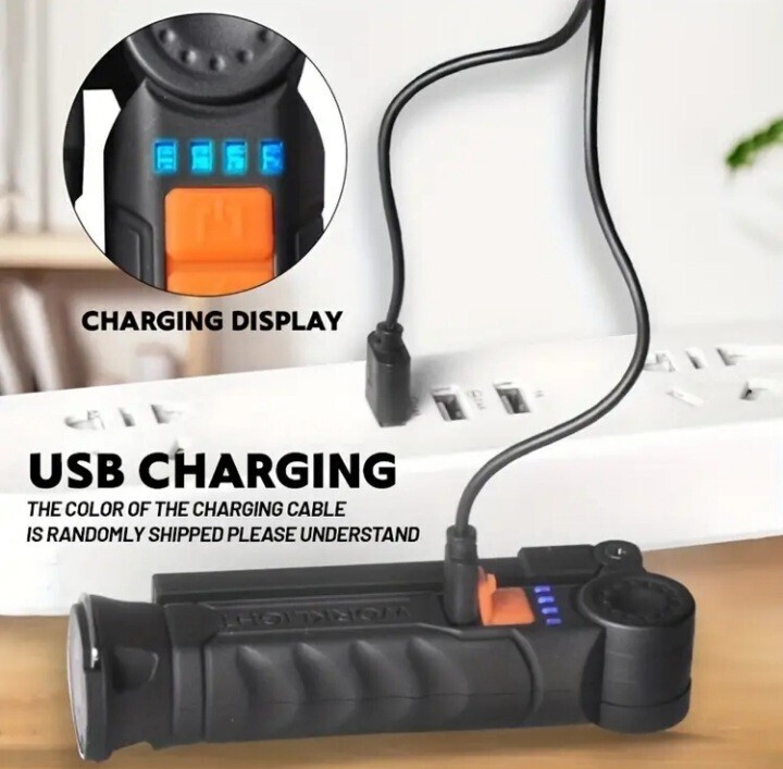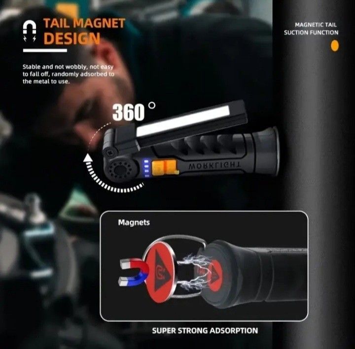 商品名:強力COB ワークライトLED作業灯。USB充電式、折り畳み可能で、360度回転機能付き。底面マグネット機能で便利に設置可能です。カテゴリは懐中電灯、ハンディライトになります。 色: ブラック系で、どんな場所、スタイルにも合います。 商品の状態: 未使用の新品です。すぐにご利用いただけます。 光源: COB LED, 高輝度で省エネ効果も抜群です。 電源: USB充電式、コンセントがない場所でも充電可能です。 設置方法: 底面マグネット、どこでも手軽に設置可能です。 毎日の生活でのちょっとした作業灯として、またはアウトドアでの利用にも最適です。