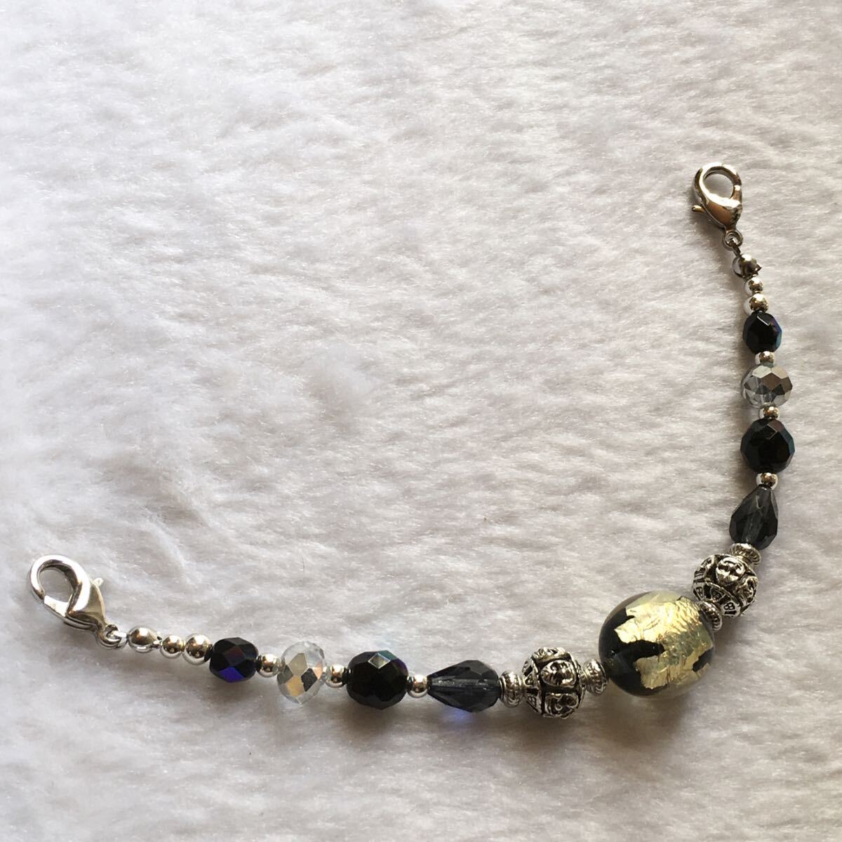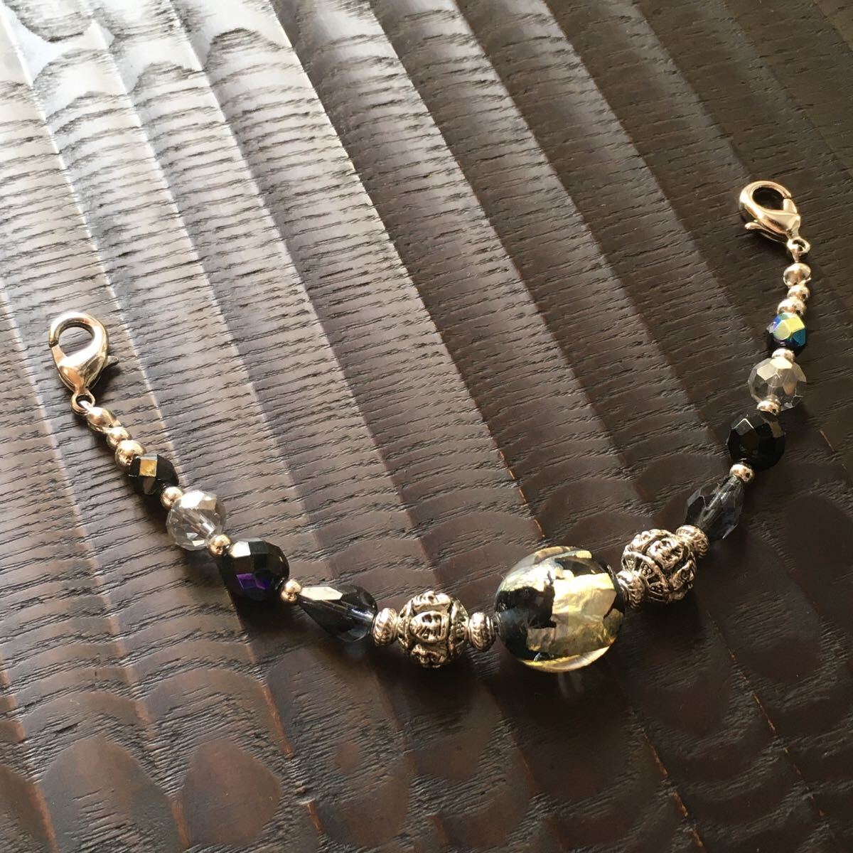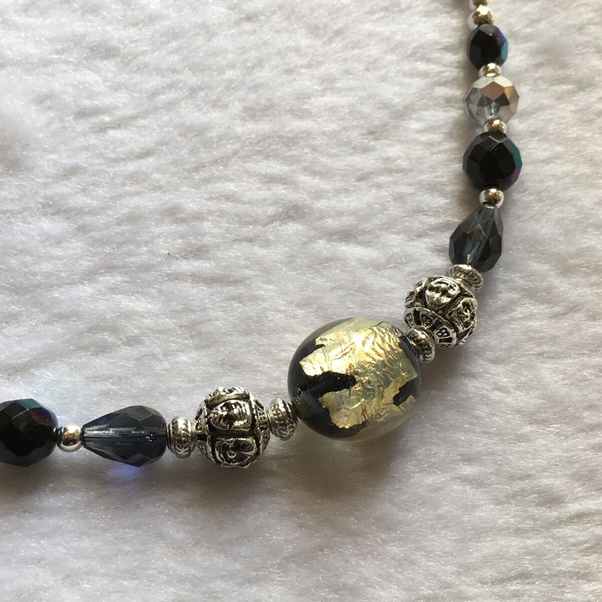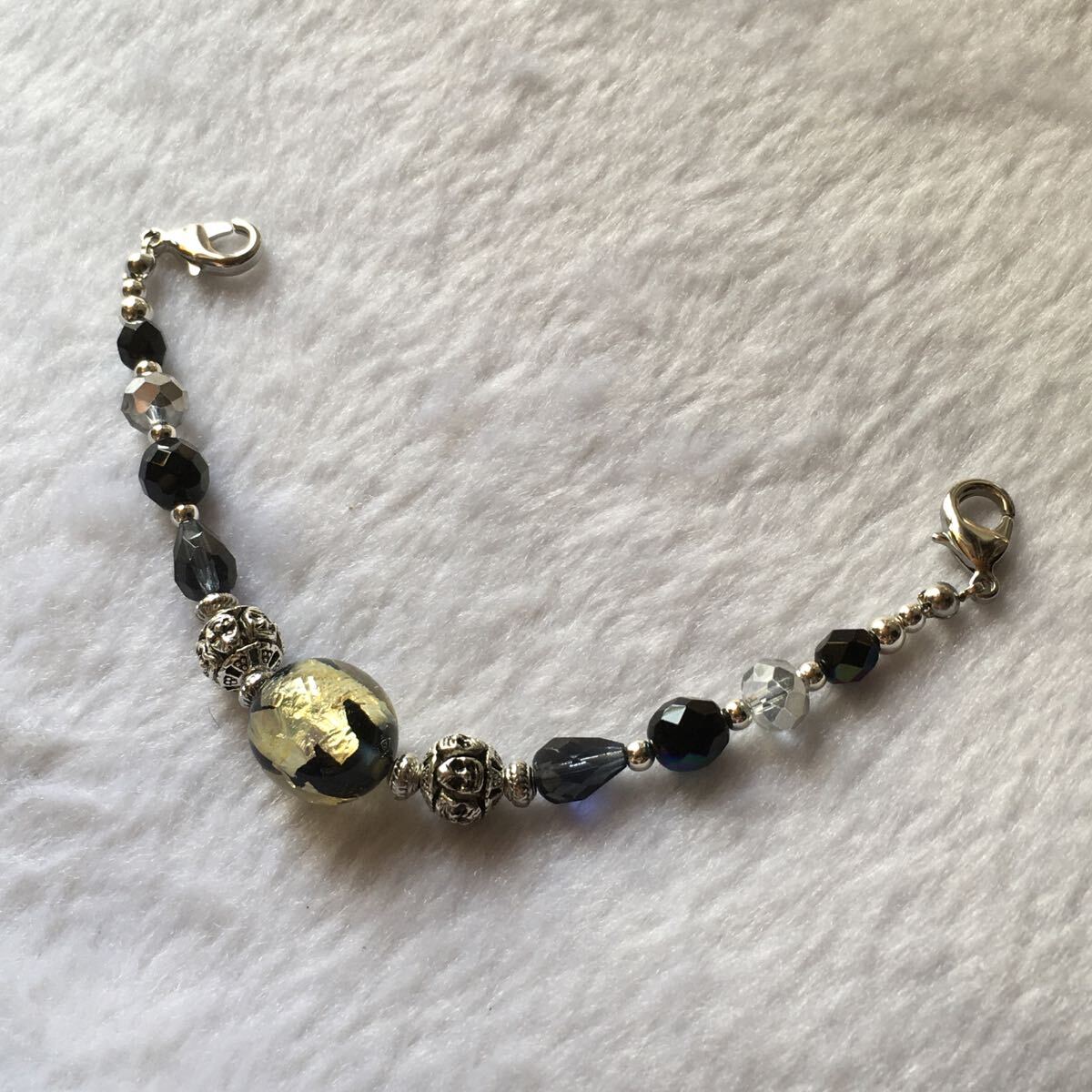 小さな手作りとんぼ玉やカラービーズを使って仕上げています。