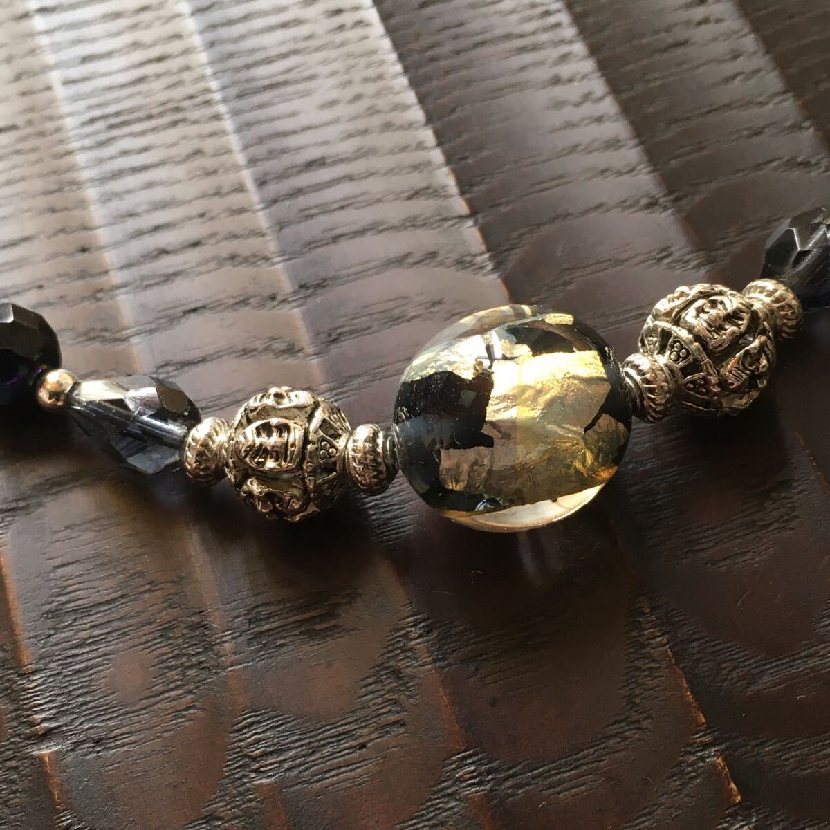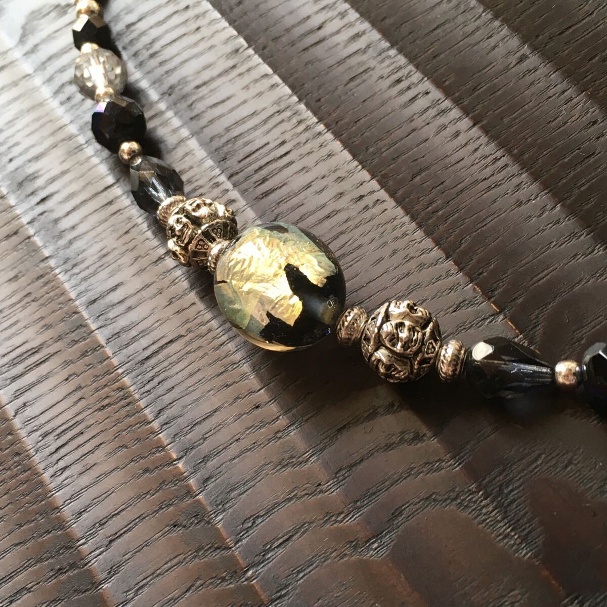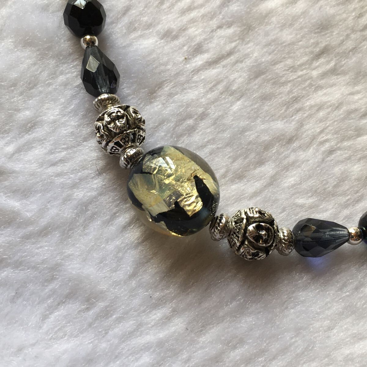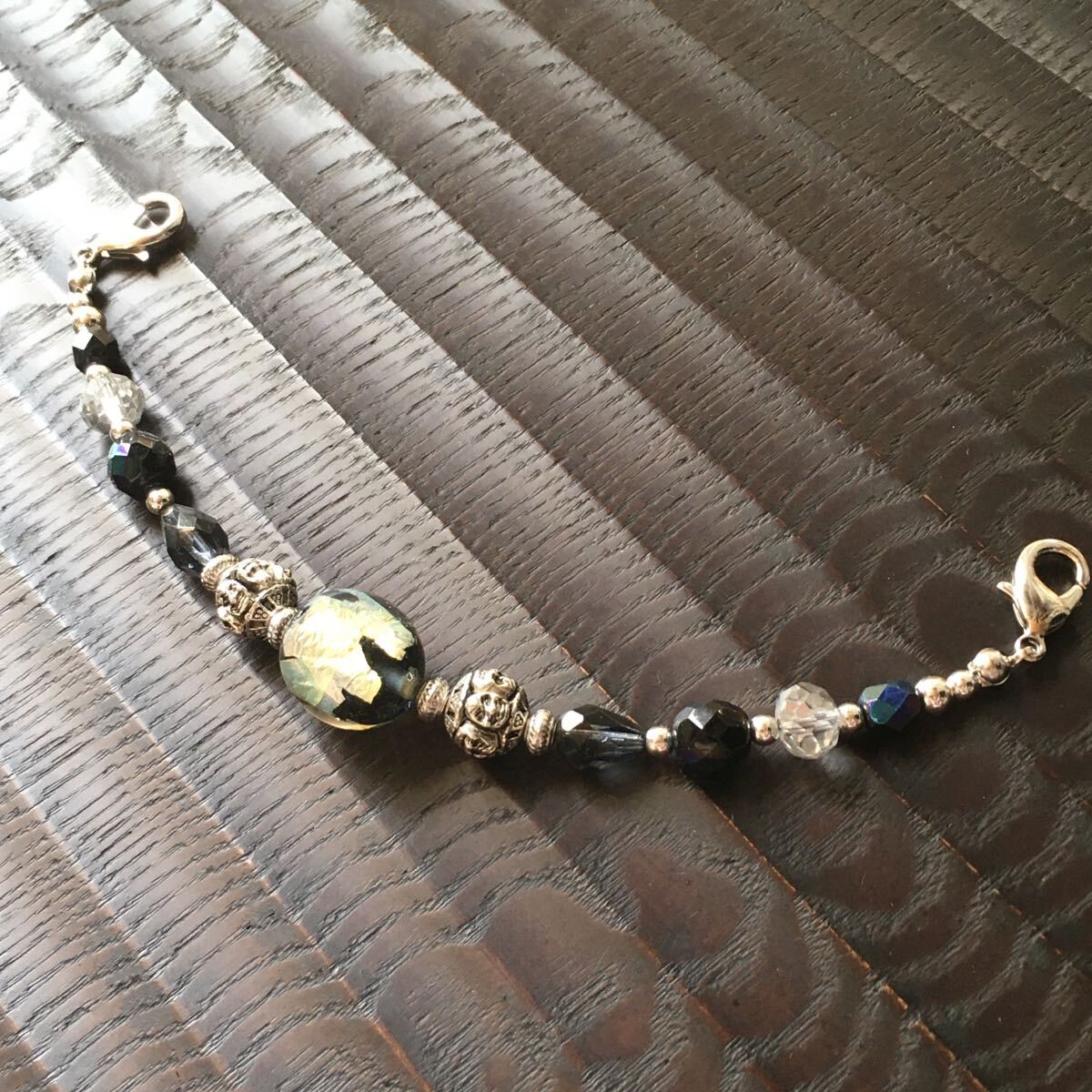 小さな手作りとんぼ玉やカラービーズを使って仕上げています。