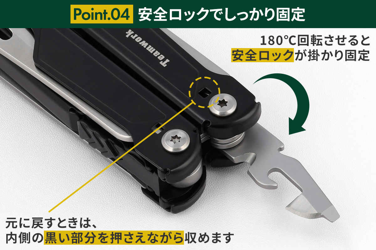 外側に収納されているドライバーなどは、引き出して180度になったらカチッと安全ロックがかかり固定します。